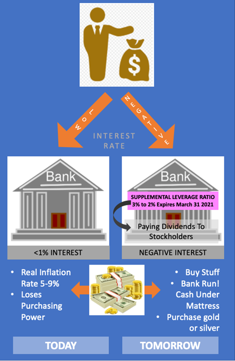 An expected return to higher bank leverage ratios on March 31st may result in negative interest rates on banked money and subsequent over-consumption with run-away inflation, bank runs with hoarding of paper money, as well as increased demand to own US-minted gold and silver coins.