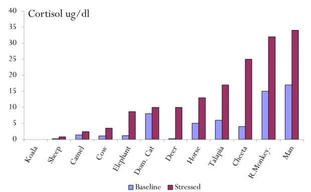 Acute stress is unique to man.  The chart below reveals the amount of adrenal stress hormones (cortisol) released by humans compared to other animals.
