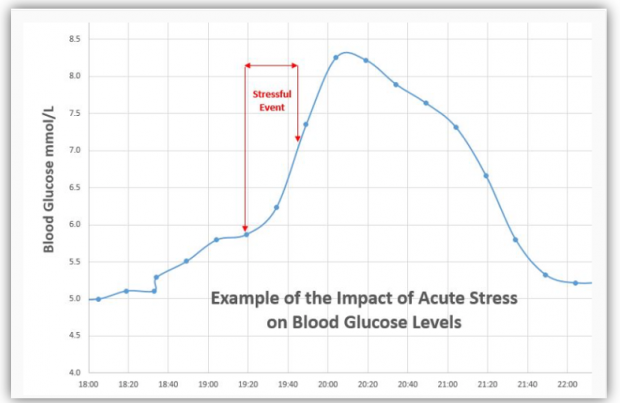 It is physical or emotional stress that activates the adrenal glands, located on top of the kidneys, to secrete stress hormones (called cortisol, adrenalin, epinephrine/ norepinephrine) that in turn release sugar stores in the form of glucose from the liver into the blood circulation.  Said another way, stress induces high blood sugar levels.