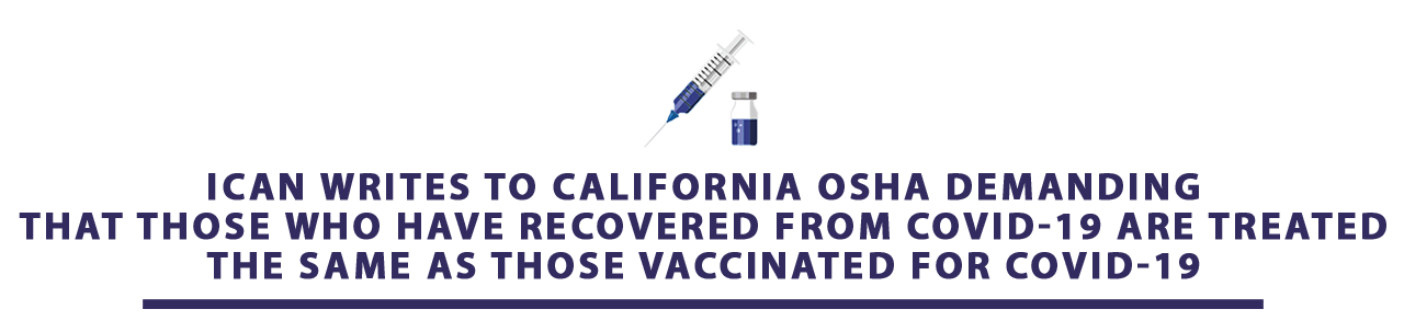 ICAN wrote to the Chief of California’s OSHA to request that, to the extent that CAL OSHA’S recommendations will allow less stringent mask rules for fully vaccinated individuals, those less stringent mask rules also be applied to those who have had COVID- 19.