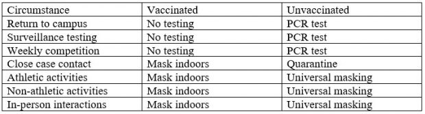 Tennessee State University athletics compete in NCAA sports. The NCAA is the major governing body of collegiate sports and has put in place strict rules and regulations for all athletic departments, with the strictest restrictions on student-athletes who have not been vaccinated. The NCAA launched a “Resocialization of Collegiate Sport” campaign that has fundamentally changed the everyday lives of student-athletes[xvi]. The campaign includes mandates on the following: daily self-health checks, face coverings during practice and physical conditioning, physical distancing, travel, COVID screenings before returns to campus, transition periods for acclimation, and routine testing.