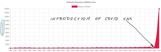 The chart depicts the number of yearly death reports following vaccination for the last thirty years. It shows that the numbers held relatively steady from 1990 until 2020, and they were generally under 500 cases per year. This changed dramatically toward the end of 2020 when the Covid vaccines were introduced. At that point, we see a rapid explosion of death reports. So exponential is the increase that the graph line shoots up almost vertically.