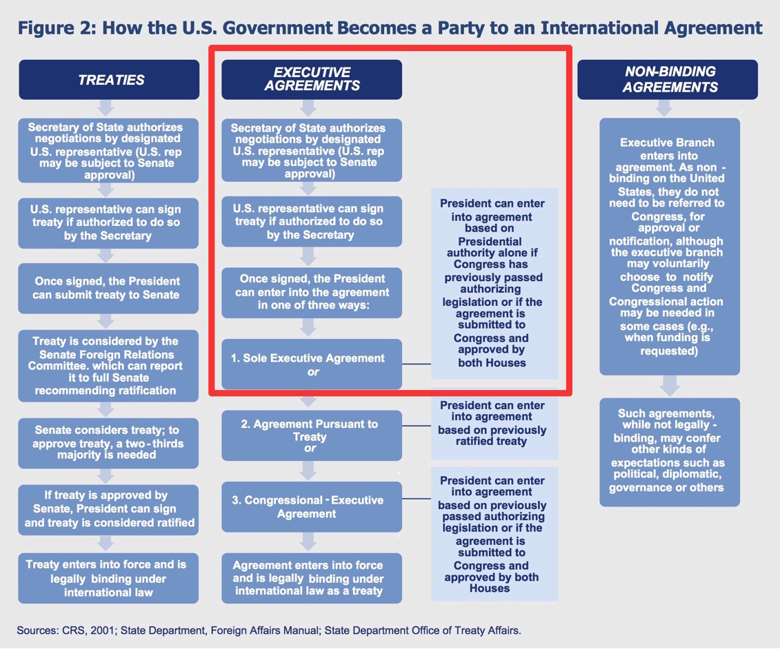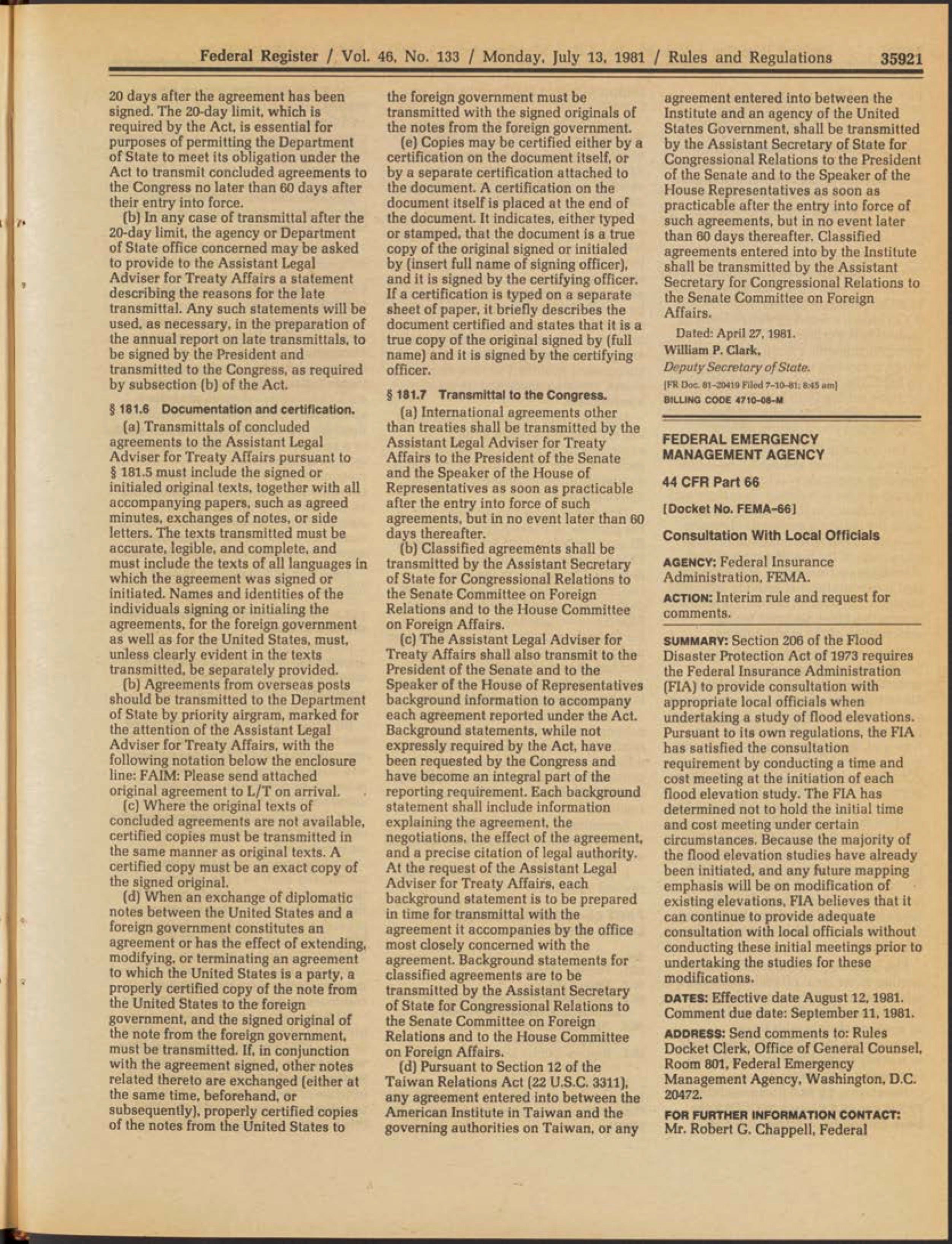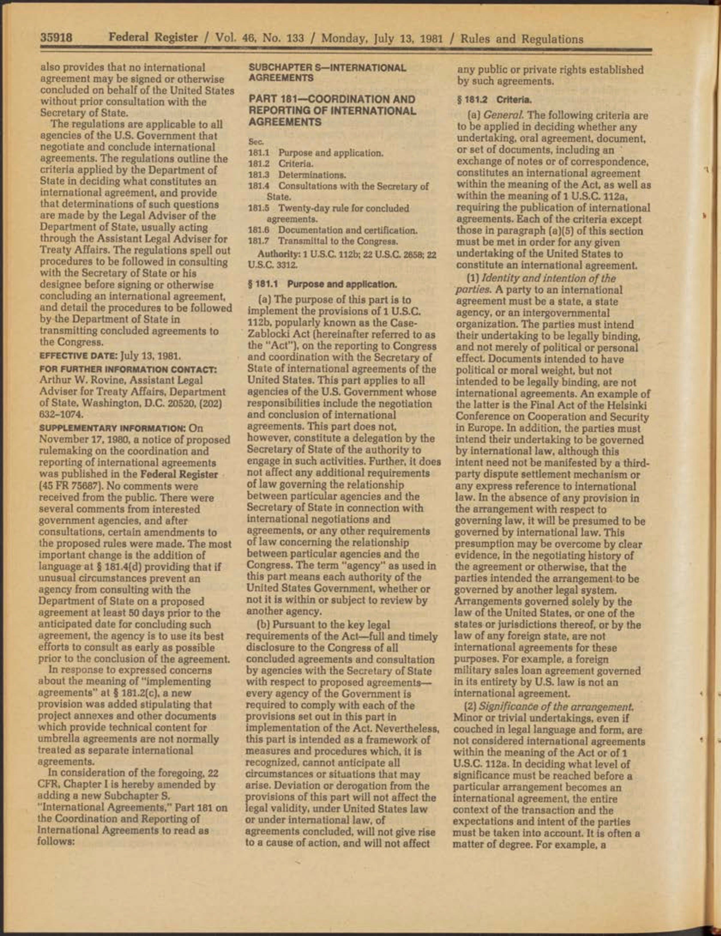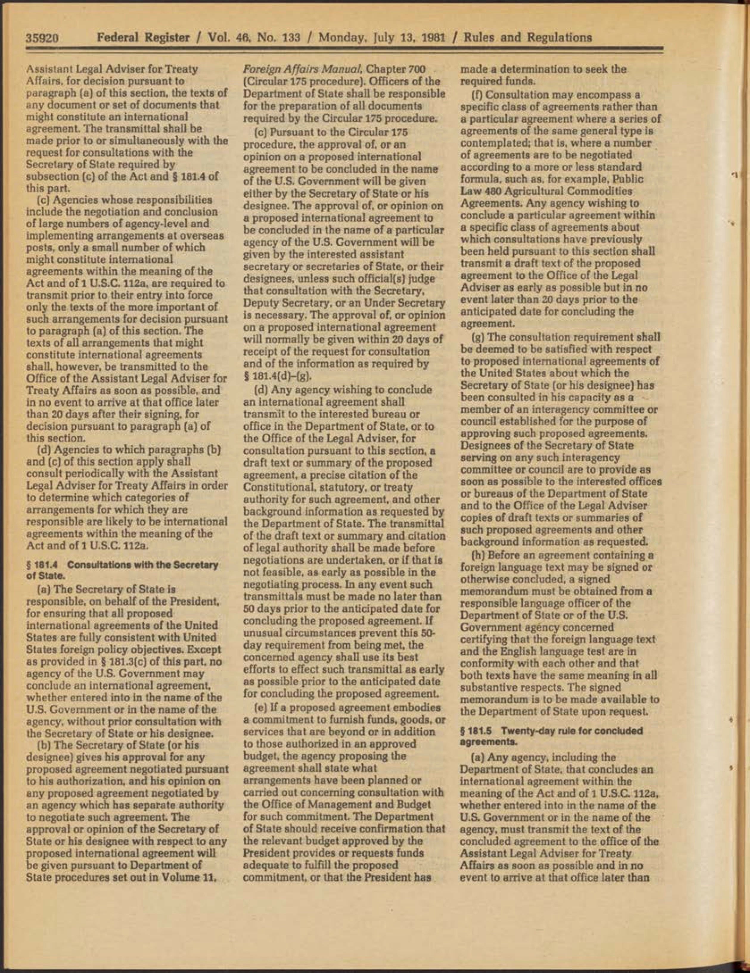 Further, the Circular 175 procedure assists the State Department in transmitting to the Congress pursuant to the Case-Zablocki Act ( 1 U.S.C. 112b) [hot link] the text of any international agreement other than a treaty to which the United States is a party as soon as practicable after such agreement has entered into force with respect to the United States but in no event later than sixty days thereafter.