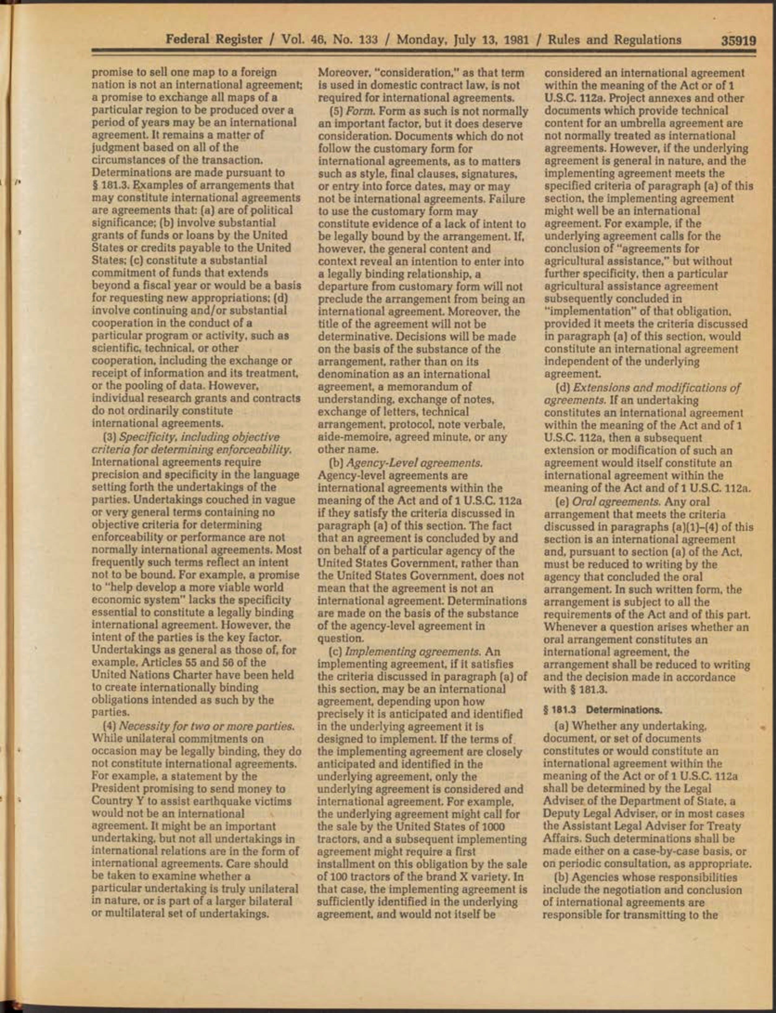 The Circular 175 procedure does not apply to documents that are not binding under international law. Thus, statements of intent or documents of a political nature not intended to be legally binding are not covered by the Circular 175 procedure. The determination whether a document is or is not an international agreement must be made by the Office of the Legal Adviser at the State Department.