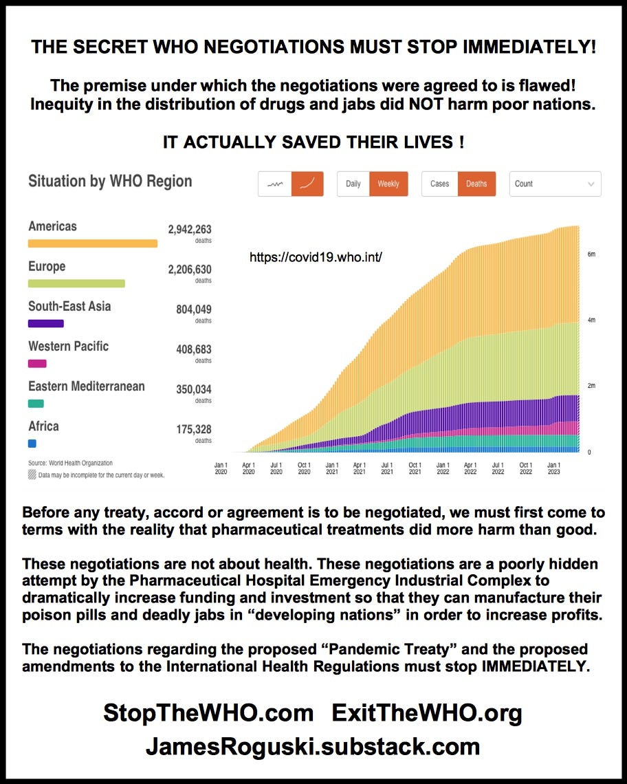 Neither a “Pandemic Treaty” nor amendments to the International Health Regulations should be debated until all of the evils of the past 3+ years have been fully exposed and all the perpetrators of countless crimes against humanity have been brought to justice.