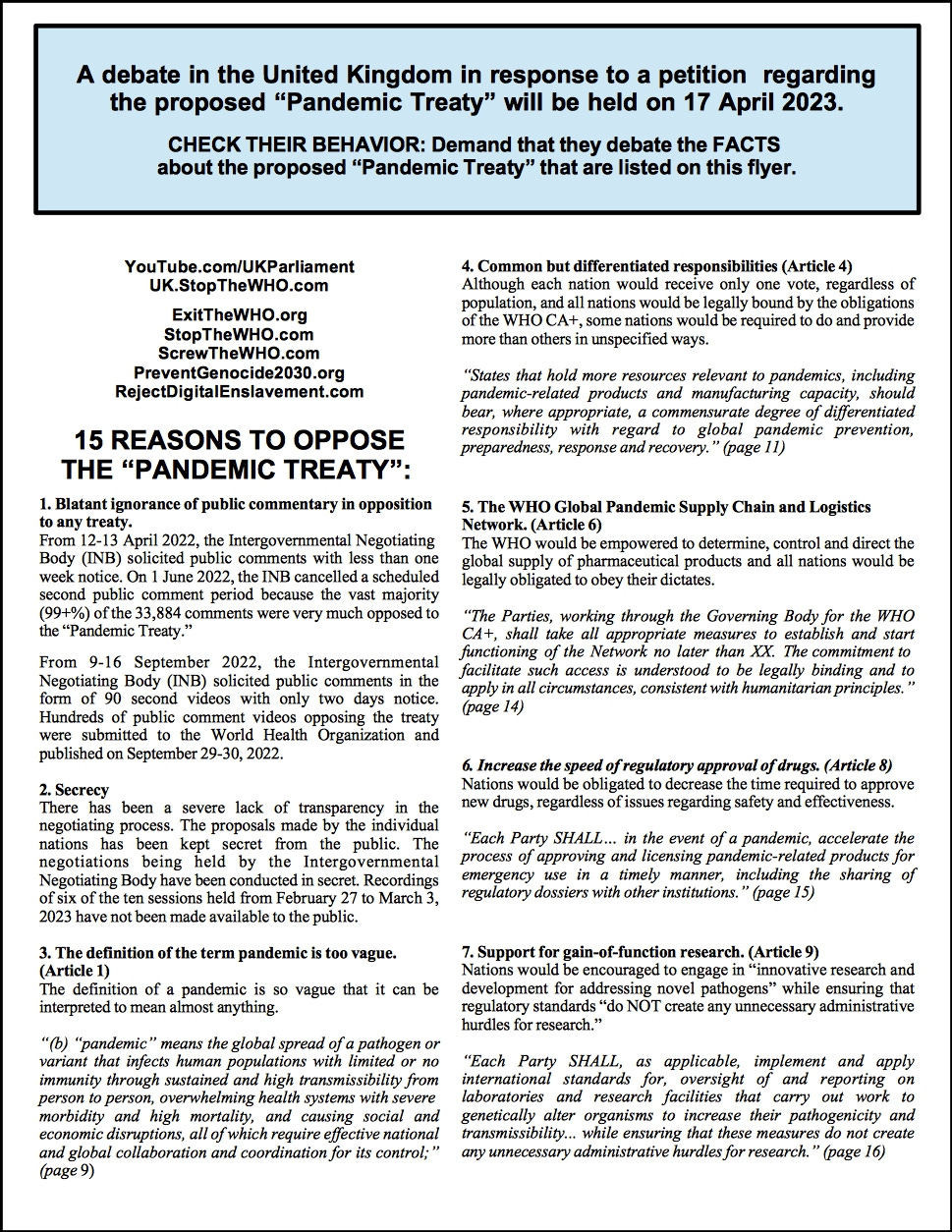 The proposed pandemic treaty is scheduled to be debated on Monday 17 April 2023 at 4:30pm UK time (8:30am Pacific, 9:30am Mountain, 10:30am Central, 11:30 Eastern)