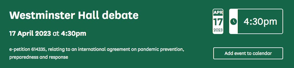 The proposed “Pandemic Treaty” is scheduled to be debated on Monday 17 April 2023 at 4:30pm UK time (8:30am Pacific, 9:30am Mountain, 10:30am Central, 11:30 Eastern)