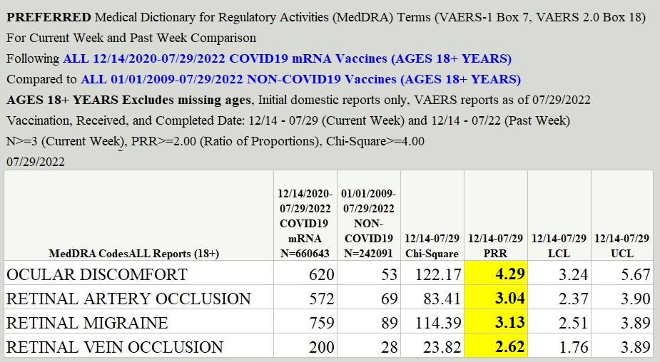 Blood Clots are common after COVID shots. Where the clots develop determines what symptoms one experiences. When it is in the blood vessels to the eye..."Following vaccination, there is a prolonged (12 week) increased risk of retinal vascular occlusion in all ages. In the two years, the risk of RVO is doubled, with 1 additional case for every 300 (65+) & 1000 (18-64) vaccinated." Pain, decreased vision or blindness. |
