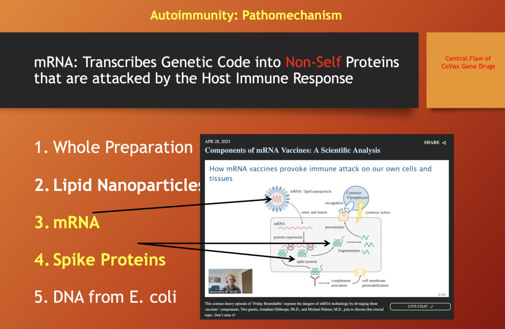 The inset diagram above illustrates how the mRNA component may cause autoimmune disease. [This schematic was presented by Dr. Michael Palmer, MD on Children’s Health Defense TV on April 28, 2023, and is used with permission. (https://live.childrenshealthdefense.org/chd-tv/shows/friday-roundtable/components-of-mrna-vaccines-a-scientific-analysis/)]