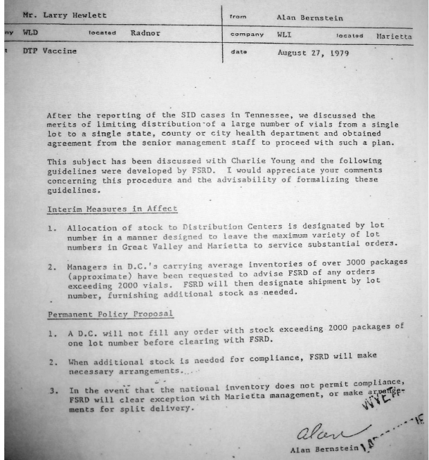 cluster in Tennessee after the use of the DTP vaccine made by Wyeth in the 1970s. The DPT vaccine or DTP vaccine is a class of combination vaccines that allegedly protects humans against three infectious diseases: diphtheria, pertussis, and tetanus.Wyeth went to great lengths to cover up SIDS by changing their policies on how vaccine lots are distributed to doctor practices to be administered. Normally they would just send vaccines out by the batch, but after the SIDS clusters were reported, they started splitting up the batches and sending them to many different parts of the country so it was much more difficult for people to make connections between SIDS or other adverse events and the injection of Wyeth’s vaccines. They continued this practice of mixing batches going forward, so who knows how many more adverse reactions or deaths were caused by their vaccines that were left unknown or ignored.