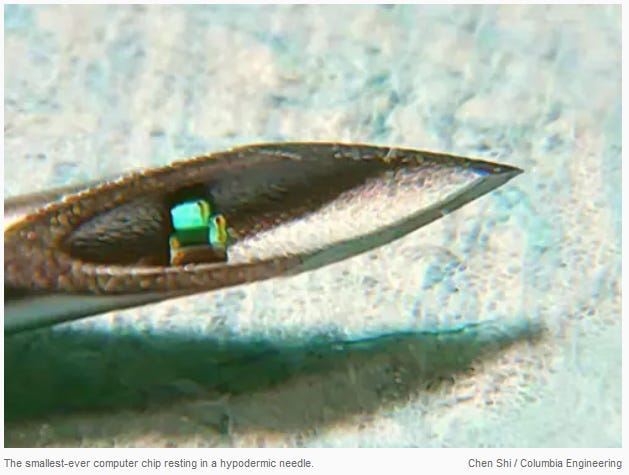 This article discussing experiments on mice discuss microchips that can be injected via hypodermic needles.
