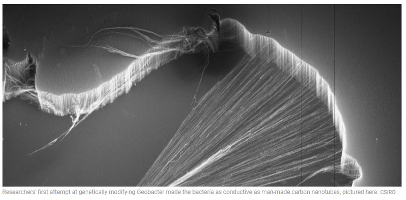 conductivity, the modified Geobacter pili already are as effective as man-made alternatives like carbon nanotubes, Lovley