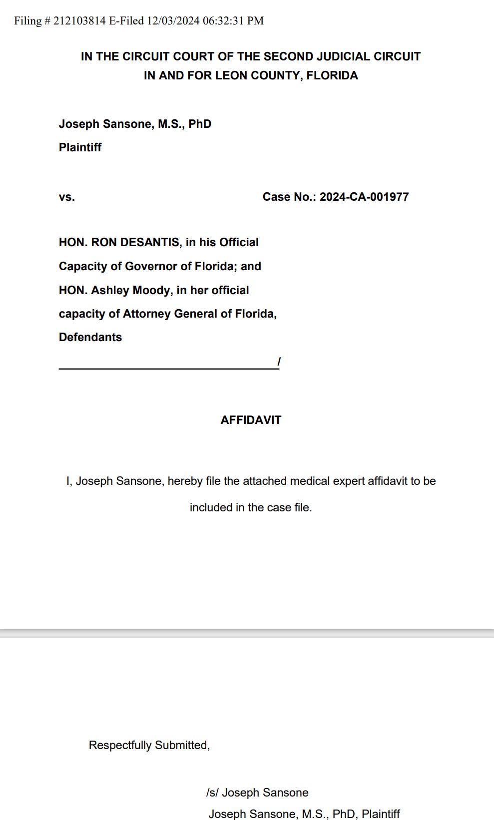 Nobel Peace Prize nominee, Dr. Ben Marble, M.D., creator of MyFreeDoctor.com provided an affidavit stating that “All covid 19 vaccine mRNA gene therapies are BIOWEAPONS which means they are POISON”. Dr. Ben Marble is the inventor of the Hands Free Toothbrush & Asynchronous Telemedicine and Founder Of MyFreeDoctor.com. Dr. Ben Marble is also the first MD to treat patients for free in all 50 States and has successfully treated ~25,000 covid 19 patients. Dr. Ben Marble is the eighth expert to file an affidavit in a new legal case seeking an injunction to prohibit COVID-19 and mRNA injections in the state of Florida because they are bioweapons. Affidavits were also provided by Francis Boyle, J.D., PhD; Karen Kingston; Ana Mihalcea, M.D., PhD; Rima Laibow, M.D.; Andrew Zywiec, M.D.; Marivic Villa, M.D., and Avery Brinkley, M.D.A screen shot of Dr. Ben Marble’s affidavit is below. An interview with Dr. Ben Marble posted in March of 2024 can be viewed here. To support this effort visit GiveSendGo Dr. Joseph Sansone is a psychotherapist opposed to psychopathic authoritarianism. Mind Matters and Everything Else is 100% independent. If you appreciate my writing and advocacy and would like to support it, please consider upgrading to a paid subscription or making a donation of any amount. Donations may be sent c/o Joseph Sansone, 27499 Riverview Center Boulevard, Bonita Springs, Florida 34134, United States, or make an online donation on Ko-Fi here. D