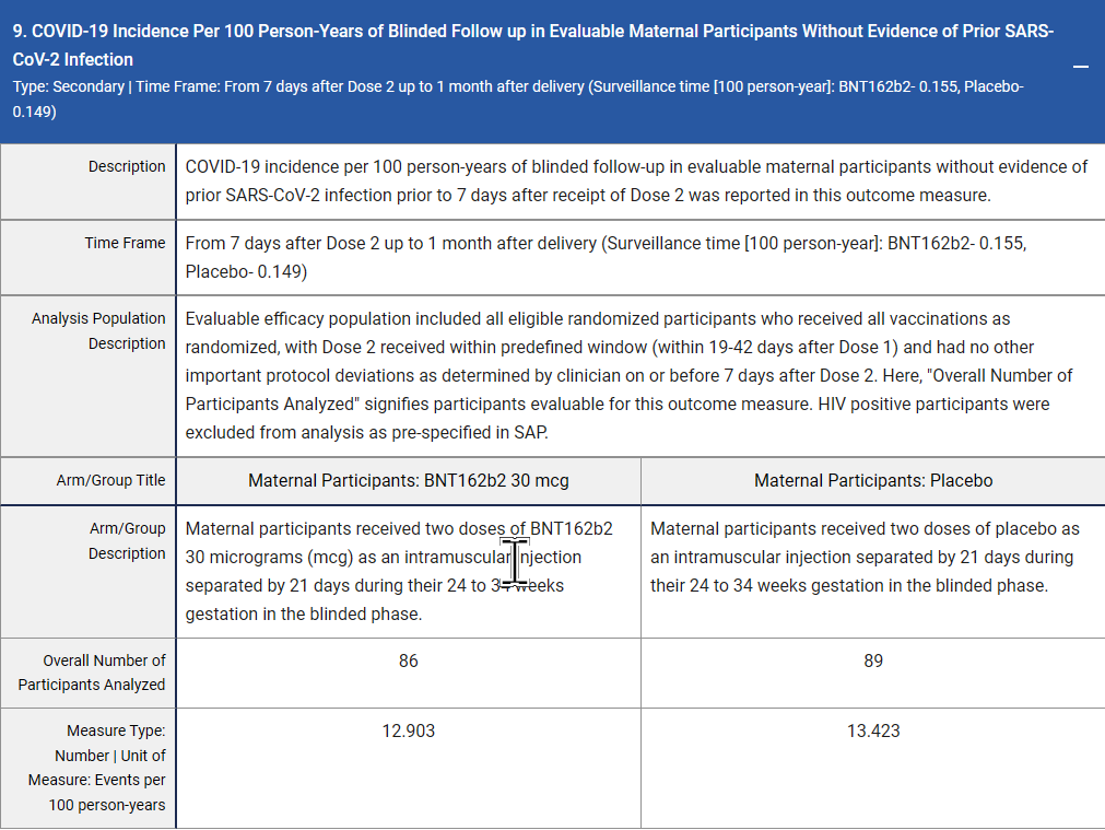 Was there a benefit? Nope. Moms in both groups got the same number of COVID infections (2 in each group). Vaccine efficacy estimated at a measly 3.8 (because the groups were different sizes). A perfect vaccine is 100. A vaccine which does nothing is 0. The 3.8 value was both tiny and NOT statistically significant. It’s entirely possible that the vaccine increased your risk of getting COVID. We can’t tell from the study.