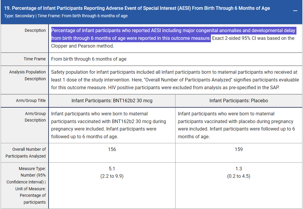 The results were first published on clinicaltrials.gov on July 14, 2023, nearly 2.5 years later (see version 21), but many parts were not reported at the time. But the birth defects were reported (section 19) at that time. So we’ve known about the AESIs for 16 months now.