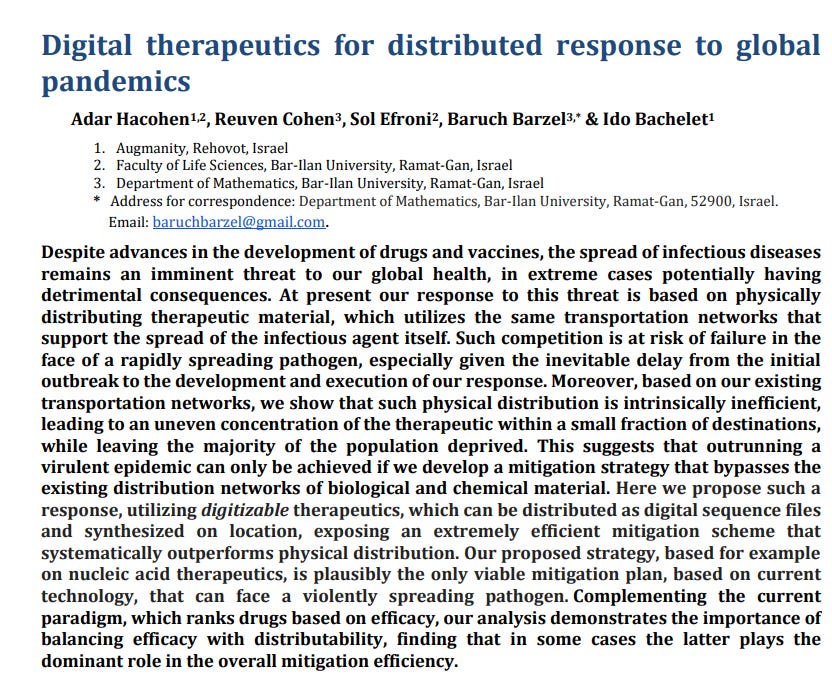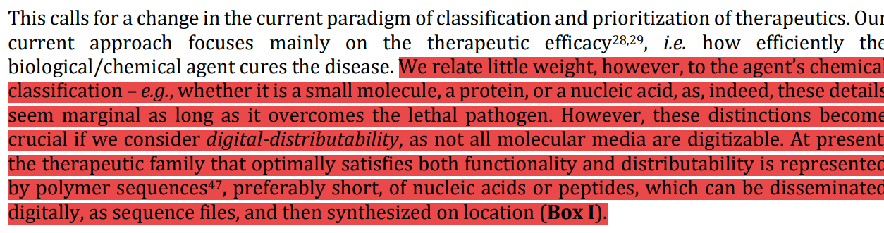 Hence, we offer to break this gridlock by focusing on therapies that can spread via alternative, intrinsically more efficient, routes compared to those of physical transport. Such alternative is achievable if the therapeutic agent can be converted into digital information, handled and distributed as data, then locally printed, i.e. synthesized, at its designated destination (Box I). Indeed, the Internet provides infrastructure to distribute data extremely efficiently, outperforming any distribution network that mobilizes physical commodities. Hence, using this strategy, a digitizable therapeutic agent will compete within time-scales that are orders of magnitude shorter than those characterizing even the most virulent epidemics, benefiting from the effectively immediate transmission of data vs. the restricted physical medium on which pathogens propagate27.