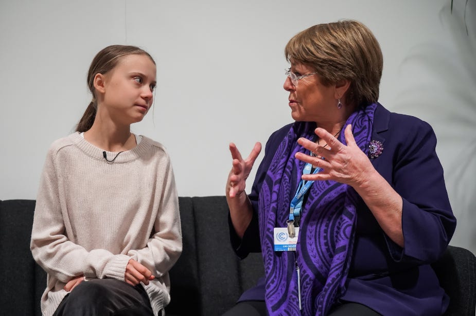 UN High Commissioner for Human Rights Michelle Bachelet spoke with Greta Thunberg, a young environmental activist from Sweden at COP25 Madrid 2019. Credit: OHCHR Photo/Anthony Headley