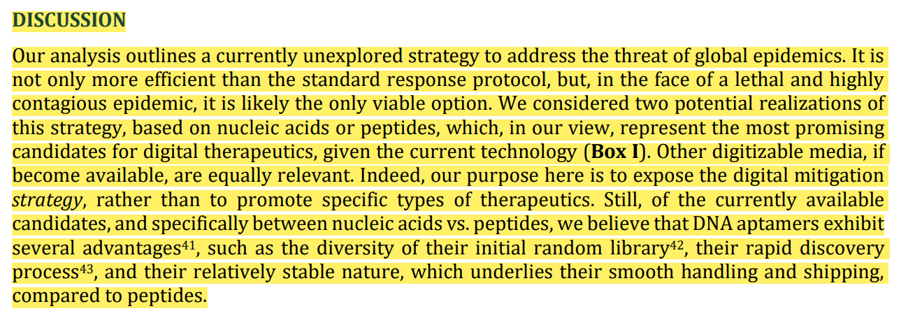If we indeed develop the technology to mass-print short DNA strands, it is likely that highly populated nodes, will also have an increased capacity to synthesize the drugs, e.g., by scaling the number of printers with population size. Therefore, while typically 𝐶𝑆 P ≪ 1, confronting a single node vs. the global demand, 𝑐𝑛 D is likely of order unity for most 𝑛. Moreover, in real scenarios, nodes with 𝑐𝑛 D > 1 can aid less capable nodes by small scale per demand physical distribution – a practical strategy to further improve dissemination efficiency, that was not included in our current theoretical framework. Finally, in case of a novel pathogen, the discovery of a therapeutic aptamer is often significantly faster43 than that of molecular drugs (Box I), potentially reducing our response time 𝑡R, which as our analysis indicates, plays a crucial role in the mitigation efficiency.