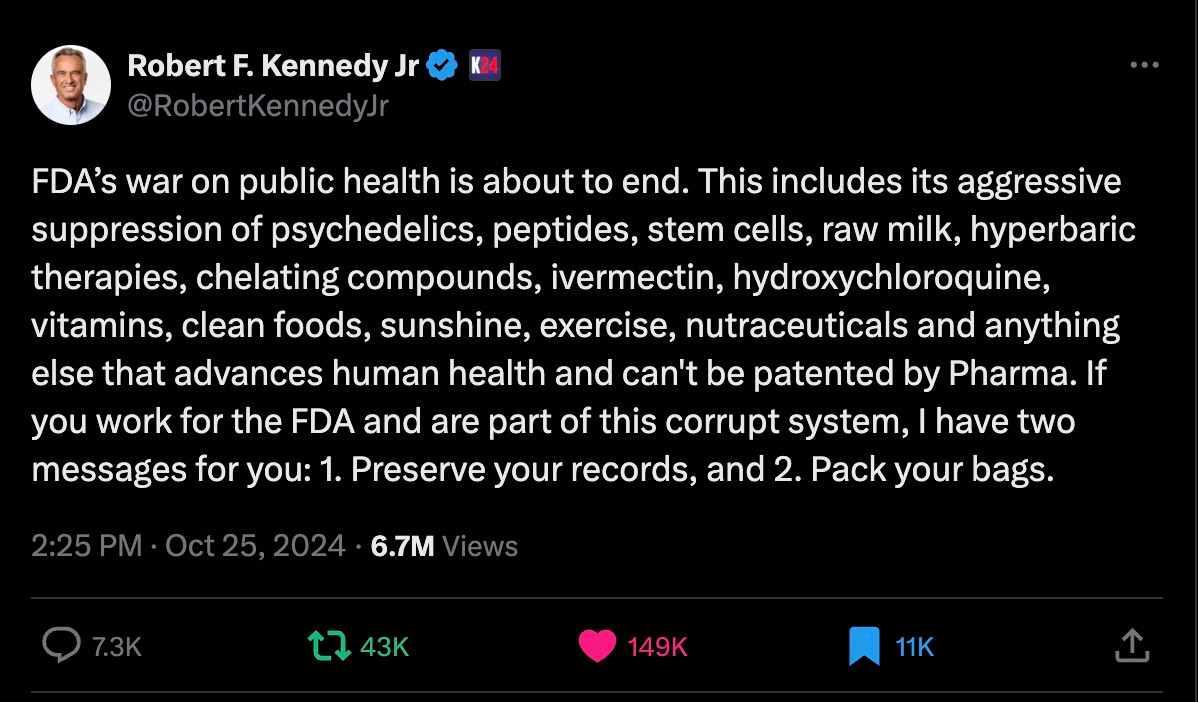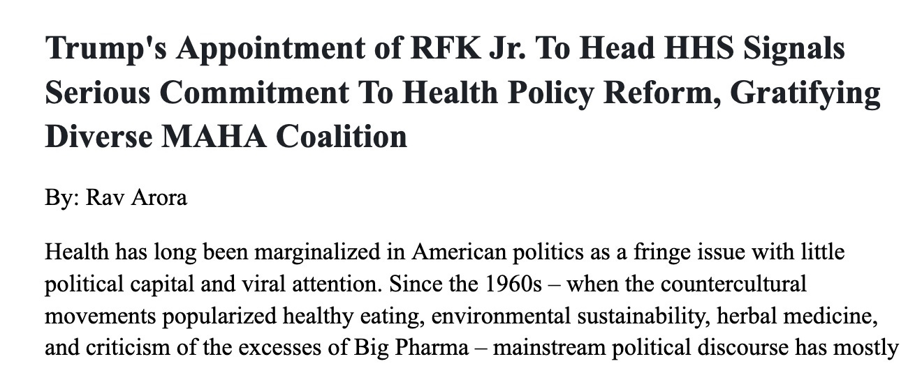 Top Media Outlet Killed My Piece Praising "Make America Healthy Again" Coalition After Editorial Board Lambasted RFK Jr.A view from the inside: how the corrupt media machine sinisterly operates. No dissent permitted, period.Last week, I was on the path to publishing a piece in a major legacy media outlet—a name all of you would instantly recognize—about Trump’s bold appointment of RFK Jr. as head of the Department of Health and Human Services (HHS). For weeks, I had been in discussions with an editor about publishing this article, which argued that Trump appears to be genuinely signalling toward transformative health policy reform. I also highlighted how RFK Jr.'s alliance with Trump has revived critical conversations about health in the political mainstream—a much-needed shift for an increasingly ailing American public. After submitting the piece late Tuesday night to meet a Wednesday deadline, I received a surprising email from my editor the following morning: “Appears we don’t approve.” She linked to a new editorial board piece labeling RFK Jr. a “fringe conspiracy theorist” likely to harm public health. Her follow-up message read, “We have come out aggressively against Kennedy.” (Note: On a colleague’s advice, I’ve adjusted details to keep the outlet and editor anonymous. I wish I could name them, but I won’t.) And just like that, my piece was axed. This is how the media machine operates in real time. A faux “consensus” forms—not through honest debate, but by suppressing dissent and promoting establishment dogma as unquestionable truth. If I needed any further proof that corporate media is, broadly speaking, a hopeless racket, this experience delivered it. To be clear, a magazine has every right to reject pitches and article submissions. It’s just awfully hypocritical and self-deranging for an institution dedicated to challenging power and influence to squash dissenters. My article was not even making any grandiose scientific claims — it was merely highlighting existing corruption such as the FDA’s revolving door and expressing optimism for RFK Jr. to put an end to that. For those wondering why I pitched this piece to a legacy outlet at all, the answer is simple: earning a reliable income and reaching a wide audience on platforms like Substack is tough without heavy self-promotion (unless you’re Matt Taibbi or Alex Berenson). Believe it or not, the story gets worse. The version of the piece I submitted was already heavily self-censored. Some of my strongest arguments—ones I was most passionate about—were removed after pushback from my editor. For instance, I had a section discussing the promising potential of psychedelic therapy for veterans with PTSD and others suffering from chronic mental illnesses failed by band-aid pharmaceuticals and shallow forms of talk therapy. You can read more about this reinvigorated interest for the Trump administration in my new piece with the world’s most prolific psychedelic researcher alive today, Dr. Matt Johnson, here: This segment connected directly to RFK Jr.’s vocal support for psychedelic-assisted therapies and his expressed interest to end the federal war against them—a stance that had generated healthy buzz in outlets like The Atlantic and Politico. But when I sent my initial draft, my editor fired back with a note in all caps: