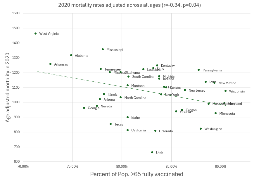In other words, one should not draw conclusions about individual behavior (i.e. is an individual more likely to die from COVID if they are unvaccinated?) from an ecological correlation because of the risk of spurious correlations. I suspected that the negative correlation in the KFF graph is also a spurious correlation. To explore this, I reproduced the KFF graph, but instead used adjusted mortality rates from a time period before vaccines were available. The below graph plots the same percent vaccination rates on the X-axis as the graph above, but the Y-axis has been replaced with age-adjusted mortality rates for the same states in 2020.