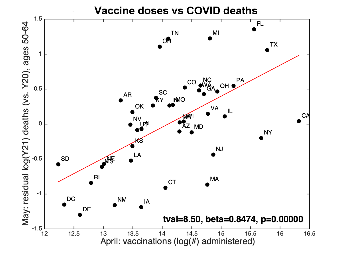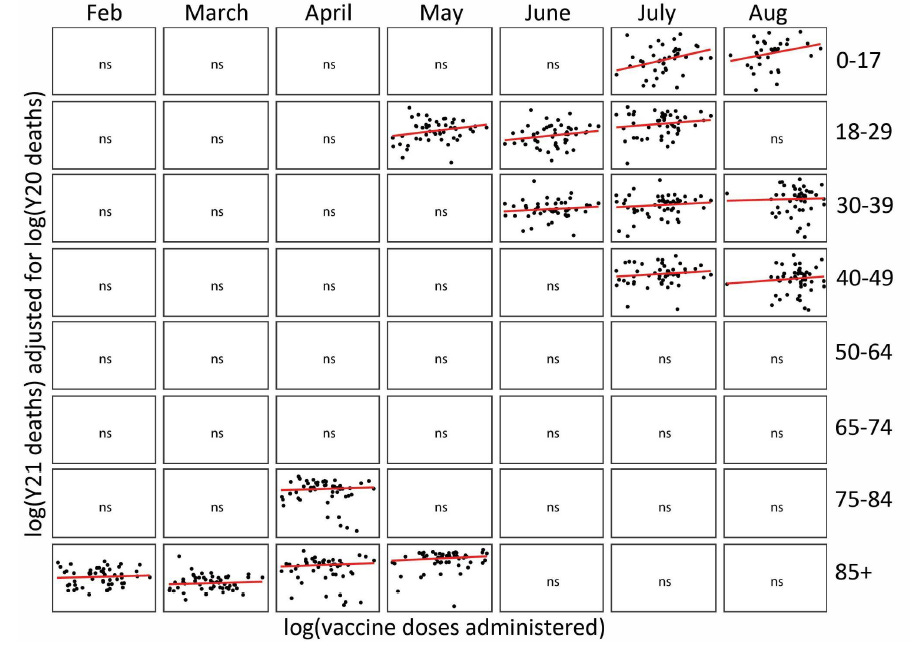 Using this approach, we see strong positive correlations between vaccine doses and COVID deaths as shown below: