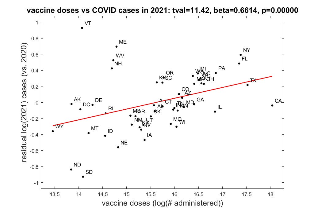 We can observe that all significant beta slopes (p<0.05 FDR adjusted) were positive. We also can observe that the temporal pattern of significant slopes falls out of the analysis in a data driven way: the pattern fits the vaccine rollout by age group in that we only observe significant slopes for adults >65 yrs prior to April, and then in adults >18 yrs old after April (the vaccine was rolled out to adults >18 yrs old on April 16th, 2021). Note that the figure only plots results up to August, 2021 because that was the latest data that was available when I started analyzing the data for the preprint (September of 2021). What is the relationship between COVID vaccines and COVID cases?Using a spreadsheet that Steve provided, I used the same procedure as above but instead examined the relationship between vaccine doses and COVID cases for the entire year (2021) compared to 2020, before the COVID vaccines became available. As expected, this results in a strong positive association supporting the idea that COVID vaccination increases your chances of contracting COVID. There is an overall weakening of the immune system within the 3-4 weeks post-injection, making COVID infection more likely during this period. I speculate that vaccine “protection’ observed in many vaccine effectiveness/efficacy (VE) studies may actually be a consequence of “natural” immunity following COVID infection in the first weeks following vaccination. Because of the 5-6 week delay in immune “protection” post first vaccine dose, the majority of VE studies censor this period or categorize individuals within 5 weeks post-injection as “unvaccinated”. Neil et al. 2024 recently reanalyzed 38 VE studies to determine the effect of such “categorization bias”. They found that categorizing individuals within 5-weeks post-first dose injection as “vaccinated” instead of “unvaccinated” yielded zero or negative VE. ConclusionThe ecological fallacy of Robinson’s paradox prevents us from deducing conclusions about individual behavior based on correlations between population-level (ecological) data, such as area-level rates or proportions. Be careful when interpreting such graphs.