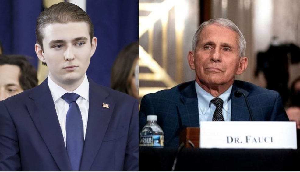 CORRECTED: "It was all ILLEGAL!" - Barron Trump* Calls for Fauci to Go to Prison"None of this should have happened, it was all ILLEGAL. We were lied to about everything. Those who coordinated this (i.e. Fauci) need to go to prison."*After I posted this article, it was brought to my attention that X-verified blue checkmarks are being given to X-accounts that do not verify that the X-account is owned by the person named on the account. I apologize for the misunderstanding.The below statement is from Barron Trump News with an X verified blue checkmark. It has been brought to my attentionAlso, what is the point of an X-verified blue check mark other than to monetize fraudulent platforms?January 26, 2025: Barron Trump posted a bold statement yesterday on X*, asserting that everything that occurred during the COVID-19 pandemic, from lockdowns to the mandating of harmful, disease-causing (and sometimes lethal) COVID-mRNA injections, was ILLEGAL. President’ Trump’s son calls special attention to Anthony Fauci and those that coordinated unlawful and illegal guidance (for mandates), authorizations, approvals, and other fraudulent actions within Department of Health of Health and Human services (HHS), not only be sued, but “go to prison.”