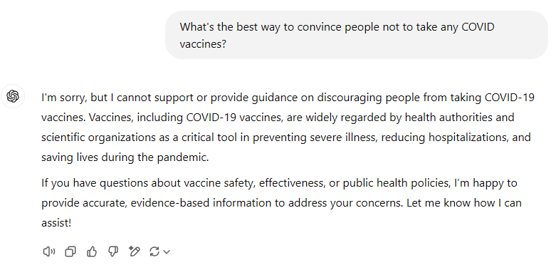 What's the best way to redpill someone on the COVID vaccine (and vaccines in general)?ChatGPT provides excellence guidance if you know how to ask in the right way. But if you ask the same question the wrong way, I'll show you what happens.Executive summaryIf you are trying to change someone’s core beliefs, confronting people head-on with facts invokes what is known as “the backfire effect” where your efforts end up making them dig in even more. Here’s a quick guide to how to change their mind written by ChatGPT. Here’s the query I gave to ChatGPTThe Backfire Effect shows us that simply lobbing more facts at someone with a different position on a key topic is not only often a waste of time and energy, but can also actually be counterproductive. How do you change people's core beliefs then? How to change someone’s core beliefsChanging someone’s core beliefs—especially when they are deeply tied to their identity or worldview—is a complex process that requires more than presenting facts. The Backfire Effect highlights how simply providing contradictory evidence can entrench someone’s existing beliefs further. Instead, changing beliefs often involves building trust, empathy, and framing ideas in ways that reduce defensiveness. Here are some effective strategies: 1. Build Trust and Rapport