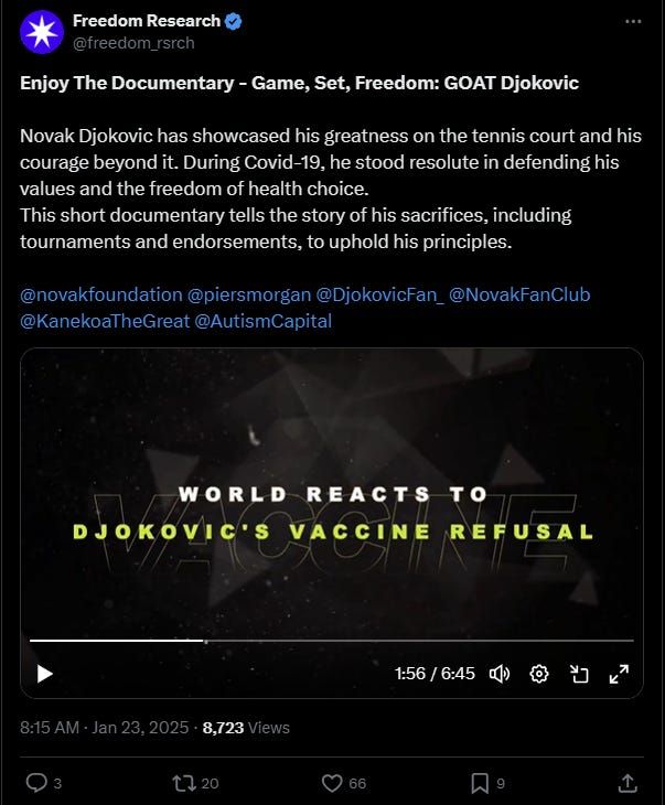 Why Novak Djokovic refused to take the COVID "vaccine"He's very careful about what he puts in his body. He determined the COVID vaccines claimed "benefits" didn't justify the risks. He's willing to bet his professional career on it. Here's his story.Executive summaryPlease watch this 6 minute documentary on X on Novak Djokovic and his decision to reject COVID vaccine mandates. “He’s willing to give it all up for his right to refuse the vaccine.” This is a tale of great courage in the face of extreme coercion. The best linesIf you are time limited, just watch for a few seconds from 1:39 to 1:55: