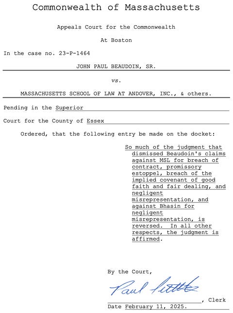 And here is the single sheet of the order: Here is the whole order: MEMORANDUM AND ORDER PURSUANT TO RULE 23.0NOTICE: Summary decisions issued by the Appeals Court pursuant to M.A.C. Rule 23.0, as appearing in 97 Mass. App. Ct. 1017 (2020) (formerly known as rule 1:28, as amended by 73 Mass. App. Ct. 1001 [2009]), are primarily directed to the parties and, therefore, may not fully address the facts of the case or the panel's decisional rationale. Moreover, such decisions are not circulated to the entire court and, therefore, represent only the views of the panel that decided the case. A summary decision pursuant to rule 23.0 or rule 1:28 issued after February 25, 2008, may be cited for its persuasive value but, because of the limitations noted above, not as binding precedent. See Chace v. Curran, 71 Mass. App. Ct. 258, 260 n.4 (2008).COMMONWEALTH OF MASSACHUSETTS APPEALS COURT 23-P-1464 JOHN PAUL BEAUDOIN, SR. vs. MASSACHUSETTS SCHOOL OF LAW AT ANDOVER, INC., & others.[1] MEMORANDUM AND ORDER PURSUANT TO RULE 23.0 John Paul Beaudoin, Sr., (Beaudoin) commenced this action against Rohit Bhasin, Michael Coyne, and Massachusetts School of Law (collectively, defendants), alleging breach of contract, promissory estoppel, breach of the implied covenant of good faith and fair dealing, reckless or negligent misrepresentation, unfair or deceptive acts in violation of G. L. c. 93A, and unjust enrichment. A judge of the Superior Court allowed the defendants' motion to dismiss filed pursuant to Mass. R. Civ. P. 12 (b) (6), 365 Mass. 754 (1974). Beaudoin appeals from the judgment that entered on the judge's order allowing the motion to dismiss. We affirm in part and reverse in part. [1] Michael L. Coyne and Rohit Bhasin.Background. The following facts are derived from the pleadings and documentary evidence before the Superior Court. At all relevant times, Bhasin was Massachusetts School of Law's (MSL) director of admissions and Coyne was MSL's president. In November 2017, Beaudoin inquired online about attending MSL. In 2018 and 2020, Bhasin contacted Beaudoin about his interest in MSL. In early March 2020, Beaudoin attended an open house at MSL, where he spoke to Bhasin, who later sent an e-mail message to Beaudoin stating that MSL was still accepting applications for the fall 2020 semester. In July 2020, Beaudoin sent an e- mail message to Bhasin asking whether MSL would be operational in fall 2020 due to the COVID-19 pandemic. Bhasin replied that MSL planned to hold "in person" classes in fall 2020. On August 6, 2020, Bhasin informed Beaudoin of his acceptance to MSL. Four days later, Beaudoin sent an e-mail message to Bhasin requesting an exemption from MSL's policy that students were required to receive influenza vaccines and, once available, COVID-19 vaccines. In that message, Beaudoin stated, "I cannot commit to that [getting vaccinated]" and citing his health history. Bhasin replied: