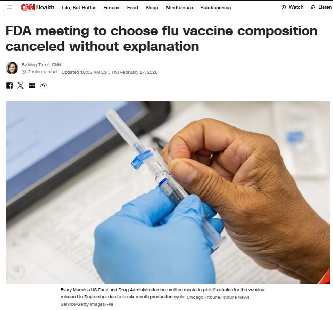 FDA Meeting to 'Pick' Flu Viruses for the Next Flu Season Has Been CancelledThe FDA's annual March meeting to “pick flu strains" (6-months prior to the beginning of the 2025-2026 flu season) has been cancelled.February 27, 2025: Every March, the FDA committee that approves the annual bird flu vaccines meets to “pick flu strains because it’s a 6-month production cycle for a vaccine released in September,” Dr. Paul Offit* told CNN. *Dr. Offit is a long-standing member of the FDA’s Vaccines and Related Biological Products Committee (VRBPC).FDA Meeting to Select Flu Strains for the Next Flu Season is CancelledThe FDA’s annual March ritual of collaborating with the WHO, CDC, ASPR and BARDA to ‘predict and select’ the flu strains that cause the next flu season has been cancelled. Dr. Offit told CNN, “No indication it’s been postponed…cancelled.” The FDA confirmed the cancellation in a statement sent to CNN today. Have the H5N1 Bird Flu Pandemic and the 2025-2026 Flu Season BOTH Been Cancelled?On October 10, 2024, members of the WHO, FDA, CDC, NIH, as well as U.S. infectious disease pediatricians (including Dr. Paul Offit), held a 6.5 hour meeting to determine the flu strains for the ‘emerging 2024-2025 H5N1 global flu pandemic.’ After Dr. Todd Davis from the CDC gave a 45-minute presentation on H5Nx virus in animals, specifically targeting US dairy cows and chickens, he opined that there was not compelling evidence that H5N1 would jump to humans, causing a human pandemic.Dr. Paul Offit was quick to correct Dr. Todd Davis asserting that the mutation of the H5N1 virus from chickens and cows to humans just ‘hasn’t happened yet.’ Listen to this 60-second clip. RFK Jr. is Saving Americans from ‘Bird Flu Pandemics’ and Unsafe VaccinesIn December 2024, Mike Bloomberg went on MSNBC falsely claiming that RFK Jr. would prevent the use of “life-saving vaccines”, despite the fact that the FDA’s Dr. Jerry Weir stated that the FDA will be providing full FDA- approval of pandemic flu-vaccines without receiving safety, efficacy or immunogenicity* data prior to granting full FDA approval. *Immunogenicity means that the vaccines cause immune responses that result in disease and deathTake a listen to this 30-second clip. “(The FDA) would not require clinical data prior to the approval… In any case during the pandemic, we would use the strain change and the safety, immunogenicity and even effectiveness data will come post-approval.” - Dr. Jerry Weir, FDA Thank You RFK Jr.In other words, prior to RFK Jr. becoming HHS Secretary, the FDA did not care if the FDA-approved flu shots prevented the flu or not. The FDA had no intentions of considering any human safety or efficacy data when approving bird flu vaccines as “safe and effective” for you and your loved ones, but RFK Jr. just changed that. Last week, RFK Jr. shut down the CDC’s misleading marketing campaign for the annual flu vaccines. Proverbs 4: 5-6Get wisdom, get understanding. Do not forget my words or turn away from them. If You’d Like to Further Support My WorkThe Kingston Report is reader-supported. Consider becoming a paid subscriber to support me and my work. You're currently a free subscriber to The Kingston Report. For the full experience, upgrade your subscription. |