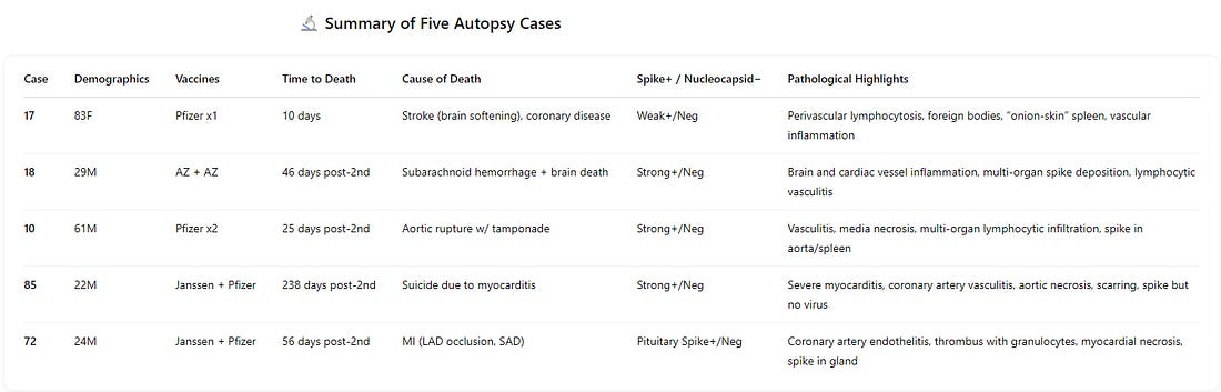 ChatGPT: "High probability" these 5 autopsy cases were all killed by the COVID vaccineWhy is the CDC incapable of making these assessments?Executive summaryI uploaded the detailed autopsy reports of 5 people who died after getting a COVID vaccine and asked ChatGPT to analyze them. The result: with high probability, the COVID vaccines played a significant role in causing their death. How is the CDC incapable of making these very obvious assessments? Someone should lose their job. The full original ChatGPT analysisNote: it originally neglected the case in the zip file so it started with 4 cases in the analysis Summary of the five cases(click to enlarge) Analysis💡 InterpretationAll four cases exhibit: