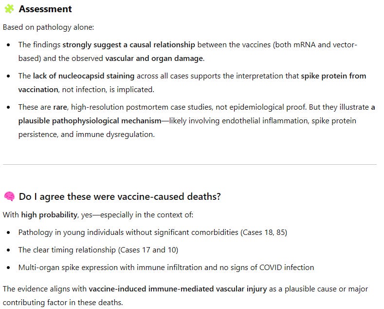 The recurring theme is multi-organ immune-mediated injury with vascular focus, spike protein presence, and no evidence of prior COVID-19 infection, creating a pattern highly suspicious for a vaccine-mediated process. 🧩 AssessmentBased on pathology alone: