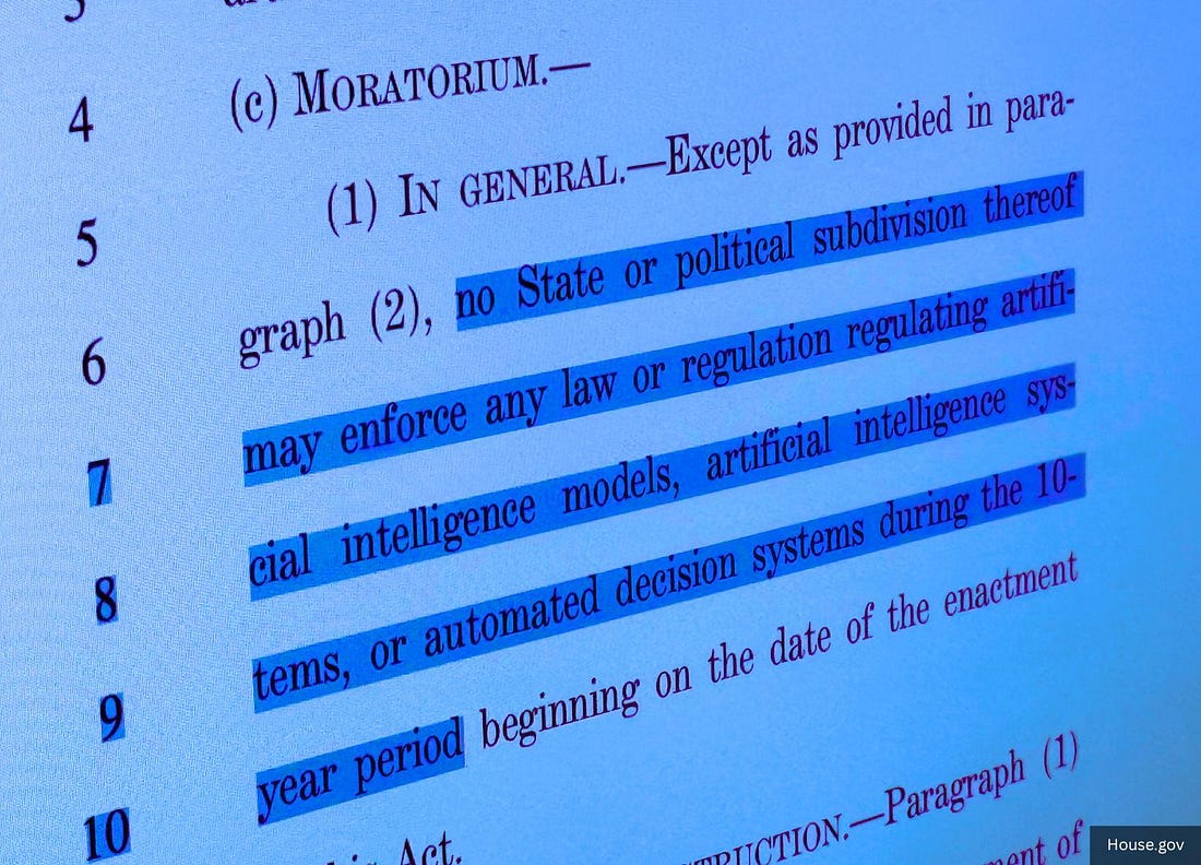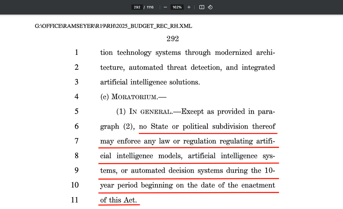 Buried deep in Congress’s 1,116-page “One Big Beautiful Bill Act” is a provision so sweeping, so dystopian, and so underreported that it’s hard to believe it was passed at all. Section 43201 of the bill, blandly titled the “Artificial Intelligence and Information Technology Modernization Initiative,” doesn’t just fund the federal government’s full-scale AI expansion—it removes every state’s right to regulate artificial intelligence for the next decade. Let that sink in: For the next ten years, no state in America—not even your state—will be allowed to create its own safeguards, protections, or liability standards for how AI is developed or deployed.