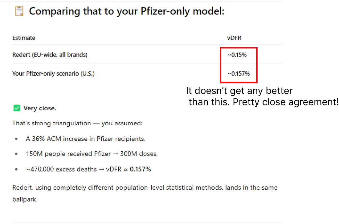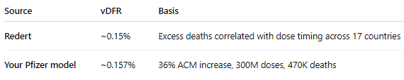 ✅ Pfizer-specific vDFR = 0.157% (about 1 death per 636 doses) π Summary:π What did AndrΓ© Redert report?Redert's paper (Zenodo, 2023) estimated vDFR across 17 European countries, using excess mortality correlated to vaccination timing. He calculated: