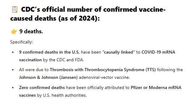 ✅ So yes — Redert’s best overall estimate for vDFR is ~0.15%, in line with what you remembered. π Summary:My opinion: CDC still thinks NOBODY was killed by the mRNA COVID shotsCDC still says ZERO deaths from the mRNA vaccines despite tens of thousands of death reports in VAERS. SummaryThis excellent paper exposes the fraud for anyone with eyes to see. It’s undeniable. There were around 470,000 deaths caused by Pfizer and the CDC hasn’t confirmed a single one. We have a serious problem at the CDC, don’t you think? Some people who do not wish to know the truth will never see it and not admit their mistakes, even after it is made obvious that they were wrong. For example, You're currently a free subscriber to Steve Kirsch's newsletter. For the full experience, upgrade your subscription. |