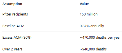 π Step 1: Estimate baseline annual ACMU.S. baseline all-cause mortality rate (across all ages): ≈0.87% per year (from CDC, pre-COVID average) So, for 150 million Pfizer recipients: Expected annual deaths=150M×0.0087=1.305M deaths/year π Step 2: Apply 36% increase in ACMExcess deaths=1.305M×0.36=469,800 ✅ Estimated excess deaths from Pfizer = ~470,000,
