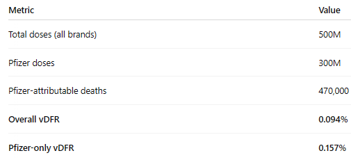 ✅ Overall vDFR = 0.094% (about 1 death per 1,063 doses) π Step 3: Pfizer-specific vDFRNow compute just for Pfizer: