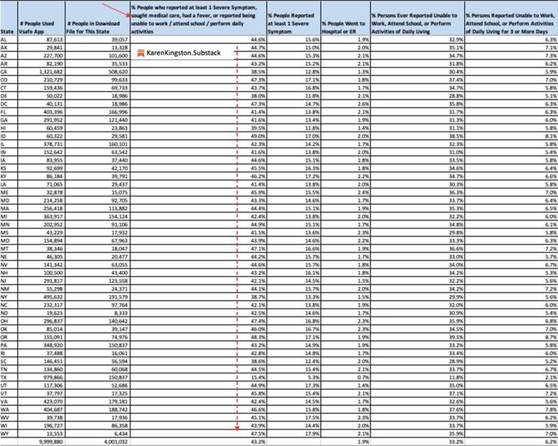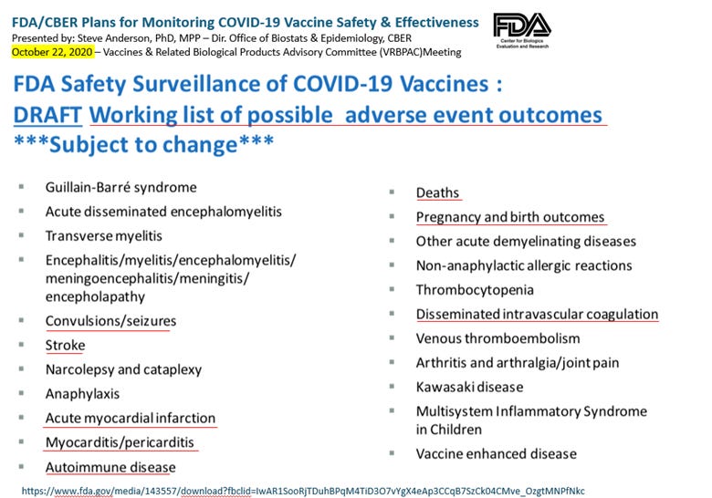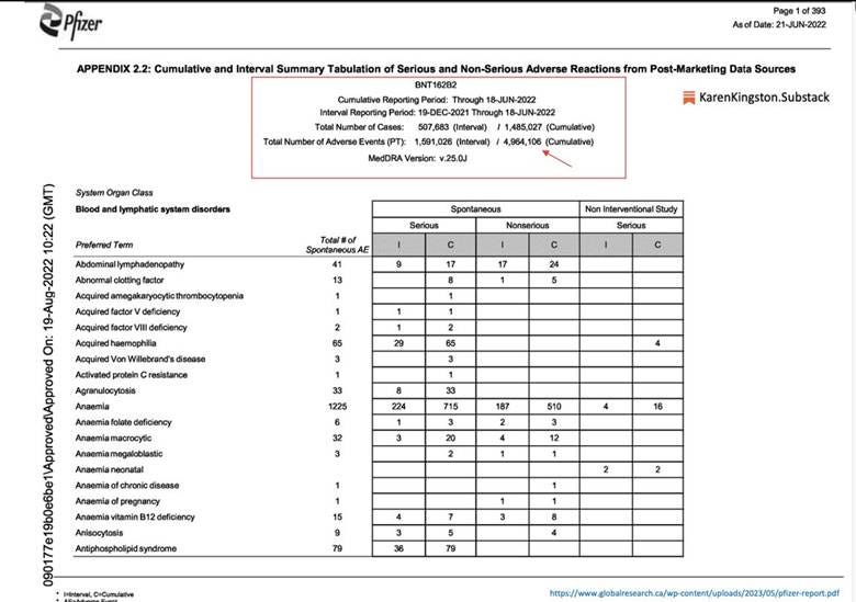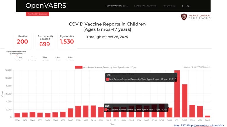 (REF: Anderson Steven, PhD, MPP – Dir. Office of Biostats & Epidemiology, CBER. Slide 16, FDA/CBER Plans for Monitoring COVID-19 Vaccine Safety & Effectiveness VRBPAC Meeting” October 22, 2020. The harmful effects of the COVID-19 mRNA-LNP injections causing nervous system disease, cardiac disease, blood and circulatory disease, musculoskeletal disease, reproductive and pregnancy disorders (e.g., miscarriages, stillbirths, birth defects, and sterility), autoimmune disease, and death are now well-documented, well-established, and well-known thanks to some of the current leaders at HHS. The COVID-19 mRNA-LNP Injection Clinical Trials Should Have Been Terminated. The Injections Should Have Never Been Authorized, Approved or DeployedBased on the knowledge that the FDA and manufacturers had on October 22, 2020, the COVID-19 injections’ clinical trials should have been terminated. Per 21 USC §312.42 (b)(1)(i), “human subjects are not to be exposed to unreasonable and significant risk of illness or injury during clinical trials.” The LNP technology delivery platform used in the COVID-19 mRNA-LNP injections has a well-established history of causing severe diseases, injuries, and deaths in animal and human studies because the highly immunogenic LNPs cross the barrier membranes of the cardiovascular, respiratory, reproductive, renal, lymphatic, and central nervous system (including the blood-brain barrier), accumulate in major organs and tissues, causing a broad spectrum of diseases, disabilities, infertility, and death, as per peer-reviewed publications. · Wang R, Song B, Wu J, et al. “Potential adverse effects of nanoparticles on the reproductive system” Int Jrnl of Nanomedicine: 2018:13 8487–8506· Cupaioli FA, Zucca FA, Boraschi D, Zecca L. Engineered nanoparticles. How brain friendly is this new guest? Prog Neurobiol. 2014 Aug-Sep;119-120:20-38.Based on the known reproductive harm caused by the mRNA-LNP technology injections, infants, children, men and women of childbearing age, and pregnant women, all of these demographics should have been excluded from the trials and the FDA should have never authorized or approved their use in these populations per 21 USC 312.42(v)(A-C). Evidence of reproductive harm was most recently demonstrated by the study Impact of mRNA and Inactivated COVID-19 Vaccines on Ovarian Reserve, published in Vaccines, demonstrating that a human-equivalent dose of the Pfizer COVID-19 mRNA-LNP injections in female Wistar rats caused more than a 60% reduction in the finite egg supply of females. The CFR for Emergency Use Authorization Requires Known Benefits of the Vaccines Outweigh RisksBased on the known dangers and high-risks of the mRNA-LNP technology platform, the COIV-19 injections never should have been authorized or approved to be injected into an adult, child, pregnant woman, or infant. Per page 8, Sec III.B.1 ‘Criteria for Issuance’: 2017 Emergency authorization of Medical Products and Related Authorities, HHS, FDA, Office of Counterterrorism and Emerging Threats), the Secretary and FDA may grant emergency use authorization (EUA) when “the known and potential benefits of the product, when used to diagnose, prevent, or treat the identified disease or condition, outweigh the known and potential risks of the product” mRNA-LNP Injections Caused Inevitable Harmful Outcomes, Disease, and DeathHowever, by following the mantra of ‘sacrificing safety in the name of science,’ the FDA granted emergency use authorization of the Pfizer COVID-19 mRNA-LNP injections on December 11, 2020, and full FDA approval on August 23, 2021. While there are thousands of analyses, publications, and data sets, demonstrating the unprecedented disease, disabilities, and deaths these shots have caused, here are a select few examples for the sake of brevity. June 2022: Pfizer Documents 5 Million Harmful Outcomes in Nearly 1.5 Million IndividualsPer an internal Pfizer document released under FOIA, as of June 18, 2022, Pfizer recorded nearly 5 million harmful clinical effects, specifically; 696,605 nervous system disorders, 539,299 musculoskeletal and connective tissue disorders (92,942 pain in extremities), and 317,811 gastrointestinal disorders, 224,633 skin, hair and nail disorders, 190,720 respiratory and chest disorders, 178,353 female and male reproductive system disorders (erectile dysfunction, infertility, heavy menstrual bleeding), 167,382 bacterial, viral, or parasitic infections (24,9010 herpetic infections), 126,993 cardiac disorders, 100,970 blood and lymphatic system disorders, 77,148 psychiatric disorders, 73,542 vascular disorders, 61,518 eye disorders, 47,038 ear and labyrinth disorders (15,833 tinnitus), 31,895 autoimmune disorders, 13,647 kidney and urinary disorders, 3,711 cancers and benign cysts, 4,056 pregnancy complications (1,859 spontaneous abortion complications, 1,143 genetic disorders, and 3,814 deaths across nearly 1.5 million victims (independent of the VAERS System). CDC’s V-Safe Data: Over 40% of Americans Reported Severe Symptoms After COVID-19 InjectionsAccording to data from the CDC’s V-Safe program—a voluntary smartphone-based health monitoring system for COVID-19 vaccination recipients—over 40% of participants reported symptoms that significantly impacted their daily activities or required emergency medical attention. This data was collected from approximately 10 million U.S. residents during the early phases of the COVID-19 vaccination rollout. Notably, Texas exhibited a significant deviation from the national average, with 15% of recipients experiencing Grade 3 or 4 adverse events, indicating a lower incidence of severe reactions compared to other states. V-Safe was launched at the onset of the COVID-19 vaccination campaign, and the data referenced in this report was last updated on July 31, 2022. VAERS Reports 22,231 Deaths and 11,917 Serious Adverse Events in Children in 2021 As of May 12, 2025, data from the Vaccine Adverse