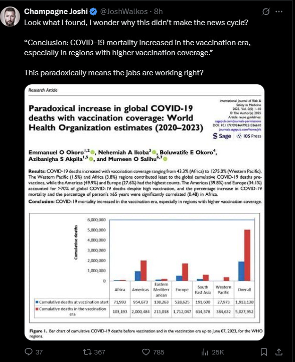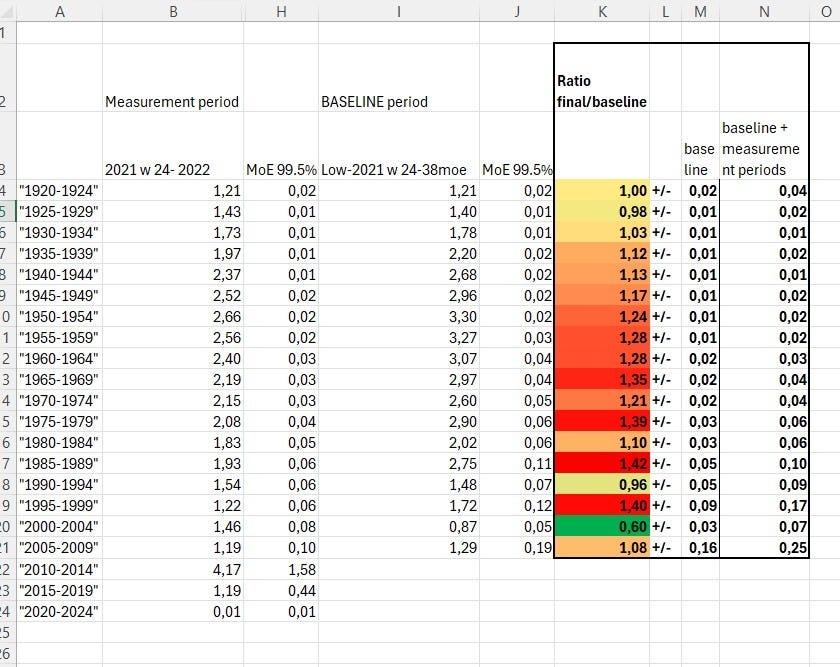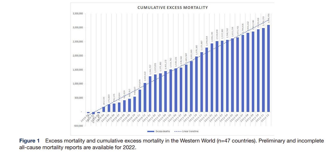 Wow. That puts a new spin on things, doesn’t it? The paper made us believe that the unvaccinated got tested more often. But they hid the reality that there was MANDATORY testing for the unvaccinated and the vaccinated could completely opt out. Can you see how the paper is misleading? Can you see how the actual policy mandating testing only for the unvaccinated can turn a vaccine that doesn’t work into a vaccine where hardly anyone who is vaccinated can get COVID? And if you can’t get COVID, you can’t die from COVID! BAM! The magic trick has been revealed. The next time you want to make a vaccine super effective, there is nothing like deploying a differential testing policy like this. Therefore, in Czechia, you get a near perfect vaccine and can write papers about it and nobody is the wiser. The right way to determine vaccine efficacyThe only honest way to determine if the COVID vaccine really worked over 2021-2022 is to measure the ACM differences between the two cohorts after vaccination was done during a no covid period (baseline differences) and then measure the ACM over the entire period and see if the ratio changes. Are there any papers that do it the right way?Nope. Not a single one. I think they want to hide the truth. Can you think of a reason they’d want to do that? What happens when you do it the right way in the Czech Republic?You find that the vaccines are killing people. Red is bad. We do get snippets of evidence confirming what I found in the Czech RepublicThe Okoro paper: The Mostert paper shows no break in the excess death trendline over the Western World countries, despite massive deployment of a near perfect vaccine that reduces cases by 90% and deaths by 90% resulting in a hypothetical 99% reduction of COVID mortality. SummaryDifferential COVID testing policies can turn a placebo vaccine into a highly effective vaccine. Not a single paper in the peer reviewed literature correctly calculates whether the COVID vaccines saved lives or not. I guess they don’t want to know. So I included the calculation here for the world to see that it can be done. It shows that the vaccines killed people in pretty much every age group. Invite your friends and earn rewardsIf you enjoy Steve Kirsch's newsletter, share it with your friends and earn rewards when they subscribe. |
