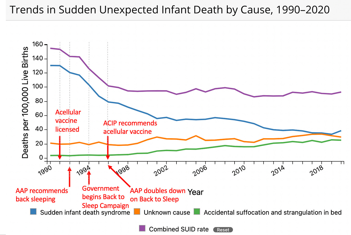 •This revisionism is not supported by the existing evidence nor the historical changes in the frequency of SIDS. Most recently, SIDS rates have had an unprecedented decrease in tandem with the COVID-19 lockdowns reducing vaccination rates.