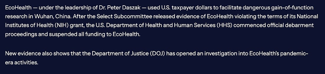 Diversionary Tactics in Action Here are some of the claims made on the “Lab Leak” web page, along with information that suggests these claims are intended to gaslight the public into believing Covid was a botched public health event whose underlying causes are being conscientiously addressed by the current administration. -PROXIMAL ORIGIN PUBLICATION Adhering to the ubiquitous Blame Fauci! distraction narrative, this claim asserts that NIAID director Anthony Fauci was in charge of prompting the famous “Proximal Origin” paper. In fact, as investigative journalist Johnny Vedmore revealed all the way back in February 2022 (an updated version of that article is available on his Substack), a group of scientists involved in biodefense/biowarfare research and affiliated with the Wellcome Trust (the British equivalent of the Bill and Melinda Gates Foundation) were actually the originators and primary conspirators behind the paper. Anyone interested in investigating the origins of the Covid crisis should look into the work and funding of the scientists listed in this article. Fauci was the side show, not the main event. -ECOHEALTH ALLIANCE This is a brazen instance of the Blame gain-of-function research! distraction, in which this type of research is presumed to be related to public health, when in fact it is almost entirely funded by military/intelligence biodefense agencies, and is inextricably linked to research on countermeasures (e.g., the mRNA platform). Here’s who funded EcoHealth (graph from December 2021 Intercept article) As you can see, most of the funding for EcoHealth came from the Pentagon and USAID, now widely known to be a CIA cut-out. It was intended for biodefense/ biowarfare research, not public health. Even if HHS “commences official debarment proceedings” against EcoHealth (which means literally nothing), it will not make a dent in this funding. Furthermore, although we’ve been treated to a dramatic expose of USAID by the Trump administration, no classified documents have been made public, and even on this dramatic “Lab Leak” page there is no mention of USAID’s role as the primary funder of Daszak and EcoHealth. The sentence “New evidence also shows that the DOJ has opened an investigation” is very strange. Is the Trump administration not in charge of the DOJ? Why do they need “evidence” that it has opened an investigation? -OBSTRUCTION OF THE SELECT SUBCOMMITTEE’S INVESTIGATION Most of the “Lab Leak” page is dedicated to enumerating all the Biden Administration — Blame Biden! — and Democratic-aligned figures — Blame the Democrats! (e.g., Fauci, Dr. David Morens, NY Governors Cuomo and Hochul) who did not cooperate with the “Select Subcommittee’s investigation.” What was this “Select Subcommitte” anyway? We have to scroll to the end of the page to learn that this was the “Select Subcommittee on the Coronavirus Pandemic,” chaired by Brad Wenstrup (Ohio-R) — a partisan committee, whose findings were focused on what the other party did wrong. It was also a cheerleading committee for Trump’s great “achievement” at the end of his first administration, as stated in the introduction: “Operation Warp Speed was a tremendous success and a model to build upon in the future. The vaccines, which are now probably better characterized as therapeutics, undoubtedly saved millions of lives by diminishing likelihood of severe disease and death.” The mRNA “therapeutics” were one of the primary end goals of the biodefense cabal’s lockdown-until-vaccine response. They bypassed all the regulatory oversight usually applied to medical product development using a pathway called Emergency Use Authorization (EUA) — a pathway reserved for military countermeasures during a CBRN (chemical, biological, radiological, nuclear) attack. No regulatory oversight or legal guidelines applied to the development or manufacturing of these products. This is the model the Select Subcommittee champions for future therapeutics development. -WORLD HEALTH ORGANIZATION (WHO) This thinly veiled Blame China! item claims that the WHO did not fail in its pandemic response on its own, but rather because of pressure from China. It is also a pat on the back for the Trump Administration’s proclamations about exiting and defunding the WHO, although such proclamations are not necessarily commensurate with the administration’s actions. In fact, according to Reuters: “The Trump administration has been considering a plan for reform at the WHO in order to remain a member state long-term, which includes withdrawing from the Geneva-based agency while negotiating, but staying in PAHO. PAHO, which was established decades before the WHO, is both the specialised health agency for the Americas and also serves as the regional office for the Americas for the WHO. The plan, first reported by Reuters, also included pushing for an American at the head of the WHO.” Whether the US permanently exits the WHO or tries to become its leader, this is another diversion away from the global biodefense public-private partnership that was in charge of Covid. Even if the WHO did not exist, the biodefense cartel’s lockdown-until-vaccine response would have been implemented through military/intelligence alliances and other global governance bodies. The WHO was a convenient conduit for response edicts and coordination. It was not in charge. -SOCIAL DISTANCING Another classic Blame Fauci! item. It’s good to have acknowledgement that the social distancing “recommendation” was not based on science. But what was it based on? Why did no one ask the obvious follow-up question to Fauci’s testimony: “Where did the guidance appear from”? The answer — which the “Lab Leak” page intentionally obfuscates — is that social distancing was part of the lockdown-until-vaccine policy. The National Security Council was in charge of this policy — not the HHS, CDC, NIH or any other 