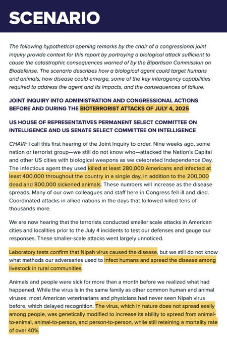 And if you read the fine print of that particular document you find that they are saying that on 4 July 2025, that´s just a month and a half from now we are going to have a biological attack on the 4th of July and we are going to have an attack that is going to, and I am quoting now, I am reading from the document: “… kill 280,000 Americans and infects 400,000 immediately. The same thing, two 200,000 animals dead with 800,000 animals sickened on a single day.”