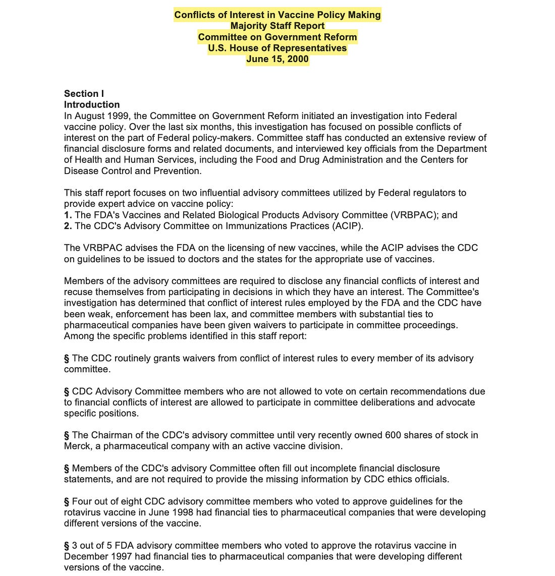 This was NOT a hostile takeover. It was a long-overdue housecleaning that may save countless American lives. A Documented History of CorruptionIn 2000, the U.S. House Committee on Government Reform published a landmark report confirming that the CDC’s vaccine advisory panel was deeply compromised by industry influence. The committee uncovered systemic, ongoing conflicts of interest within both the ACIP and the FDA's vaccine advisory counterpart: