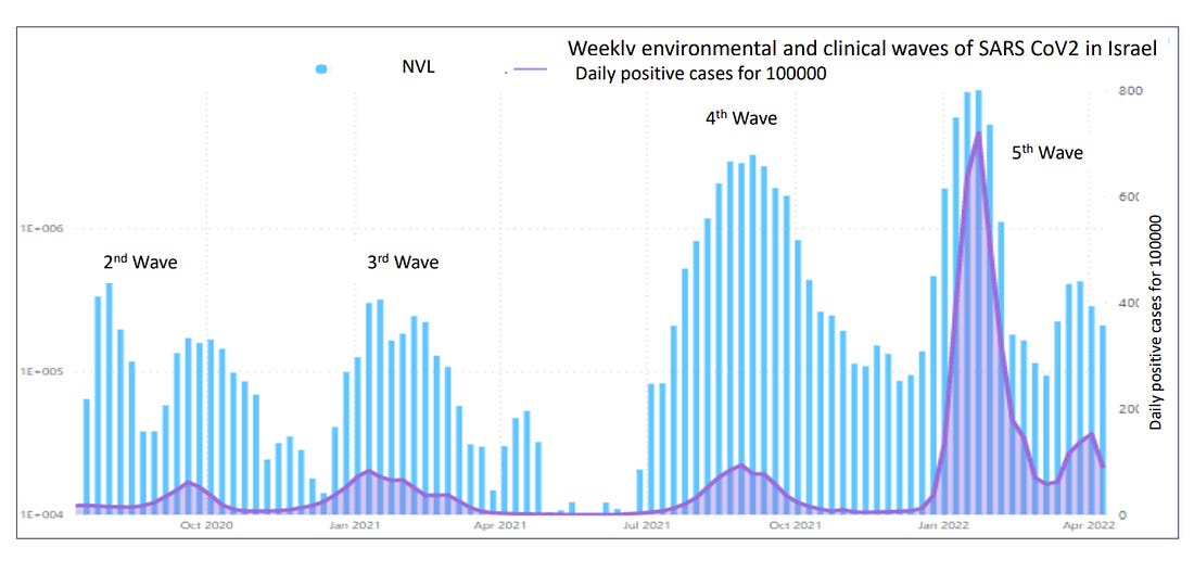 Below is the Israeli wastewater. The 3rd wave is alpha, 4th is Delta, 5th is Omicron. It’s a LOG scale so Delta was 10X higher in highly vaccinated Israel. So the Cleveland Clinic study, other studies, and surveys were all correct: