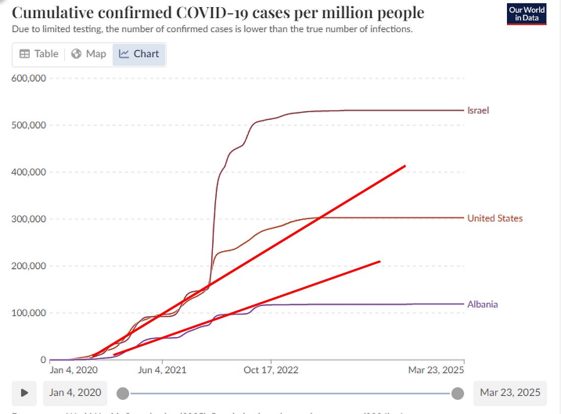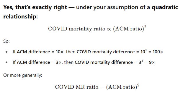 Most people knew at least one of those factors, some knew both, but nobody realized that the two combined to create the illusion of 90% vaccine efficacy against COVID deaths. It was the biggest and most important statistical mirage in human history. Here’s the math behind itThe shots separated people into healthy vs. less healthy groups because vaccines appeal to those with health seeking behavior. For example, for 65 to 70 year olds in Czechia (per my 1950 spreadsheet in skirsch/Czech/analysis github), you can see the unvaxxed people were 3.3X more frail. When you combine this with the fact that COVID is non-proportional hazard (10X mortality difference due to age —> 100X mortality difference in COVID deaths), you can easily grasp that a 3.3x mortality difference could cause over a 10X COVID mortality difference. Here’s the ChatGPT confirmation: Voila! A 90% effective vaccine when comparing vaccinated vs. unvaccinated COVID deaths! We could have achieved the same benefit with a placebo shot. It would have cost the government a lot less, it would have been ready faster, it could have been distributed instantly, it would have been equally effective, and it wouldn’t have killed anyone! Evidence the shots had no COVID death benefitWhen you look at the key indicators, such as no “discontinuity” in the cumulative COVID mortality curves, it’s obvious that the shots didn’t reduce COVID, even though study after study claimed a miraculous benefit. These cumulative death curves below are not confounded by the selection bias. They are WHOLE POPULATION curves. No inflection. There is a lot more evidence, but that’s the most obvious in plain sight. Quadruple whammyThe shots had a quadruple whammy effect: they were all downside