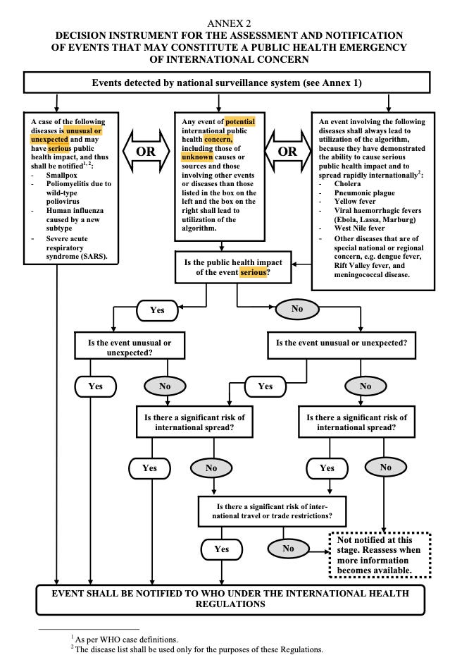 My reply: Another person to ask about this is James Roguski I have spent far less time studying the WHO International Health Regulations than Roguski has. I think the WHO-IHR is probably the legal instrument whose contents would address this question. I've focused on studying American federal and state law, because the WHO-IHR, in itself, has limited enforcement mechanisms. My understanding is that the enforcement mechanisms the WHO-IHR does have come mostly by reference to other treaties and trade agreements, that can be used to financially penalize non-compliant countries. (Other enforcement mechanisms include the terms of vaccine supply contracts that prohibit third-party testing of delivered products and designate state assets as collateral to be forfeited in the event the purchasing government violates contract terms.) WHO-IHR directs or requires participating member-states to adopt and implement their own domestic laws for pandemic surveillance, reporting and response measures, and subjects them to financial penalties if they don't adopt those implementing laws. For example, Article 56, Section 4: "Nothing in these Regulations shall impair the rights of States Parties under any international agreement to which they may be parties to resort to the dispute settlement mechanisms of other intergovernmental organizations or established under any international agreement." I looked briefly last night and this morning at the WHO-IHR, as of the 2005 amendments, with your questions in mind. In the definitions section, the WHO-IHR defines a PHEIC as "an extraordinary event which is determined as provided in these Regulations i. to constitute a public health risk to other States through the international spread of disease and ii. to potentially require a coordinated international response." There's a schematic diagram at Annex 2, called a "decision instrument for the assessment and notification of events that may constitute a public health emergency of international concern." One of the three potential pathways mentions an "algorithm" but I haven't located any other references to an algorithm in a keyword search of my files. (That doesn't mean there isn't an algorithm. I just don't have more information about it currently.) In a Federal Register notice Feb. 6, 2020 (85 FR 7874) about quarantine and airline reporting requirements, HHS-CDC used the WHO-IHR definition in a footnote: "Under the International Health Regulations, a public health emergency of international concern is 'an extraordinary event' that constitutes a 'public health risk to other States through international spread of disease and to potentially require a coordinated international response." Screenshots of the decision diagram from Annex 2 of WHO-IHR 2005 below; link to the 82-page WHO-IHR, Third Edition in which the Annex is located. The 2005 WHO-IHR language is general, circular, or self-referential: "unusual" or "unexpected," cases of disease, events "of potential concern" or events of "unknown causes or sources," with cases identified "as per WHO case definitions." I also located a July 22, 2022 WHO document about case definitions, which uses general clinical symptoms (cough, fever) or epidemiological criteria (contact with probable or confirmed cases), or positive-result from non-validated diagnostic tests. There may be other provisions in the 2022, 2023 or 2024 amendments that Roguski would be able to describe and explain their applicability to your question. My provisional understanding is that the WHO-IHR framework is the same unilateral, no-physical-evidence-required, no-validated-case-or-causality-validation-methods-required framework as the US federal framework that centers on the unfounded, unilateral assertions of the HHS Secretary. To the extent there are no firm, physical criteria or requirements for validated physical/analytical methods capable of validating the stable identity of an allegedly disease-causing pathogen and its capacity to cause disease, and no procedures in the WHO-IHR for challenging claims that a PHEIC is occurring, I don't think there are any legal bases or venues on or in which the falsity or invalidity of such claims could be brought for review and reversal. In other words, my interpretation of the PHEIC legal instruments is that, like the US federal and state laws, the WHO-IHR is also written so that no one can be found in legal violation of a rule they were never required to comply with, nor can anyone be found to have failed to meet an evidentiary standard they were never required to meet. Deception, fraud, misrepresentations, mischaracterizations, etc. are legal, because there are no legal obligations to provide evidence, and no standards of evidence against which claims can be tested, and no procedures or venues through which claims can be challenged and tested. Sometimes I think of it in terms of criminal prosecutions in a context in which framing a human suspect has been legalized. It's as if criminal prosecutors were not required to present any evidence that a crime occurred, nor any evidence that the human suspect had means, motive or opportunity to commit the crime, nor that he or she actually committed the crime. And it's as if the prosecutor were not required to go before any fact-finding tribunal (judge or jury), because evidence and evidentiary-review are both irrelevant to the prosecution and conviction process. The conviction occurs simultaneous to the allegation. In the public health emergency context, allegedly stable, allegedly-disease-causing pathogens are framed, and they are not entitled to any due process. They're convicted as of the allegation, and all the pandemic management policies and programs unfold from that point in time onward. Related: