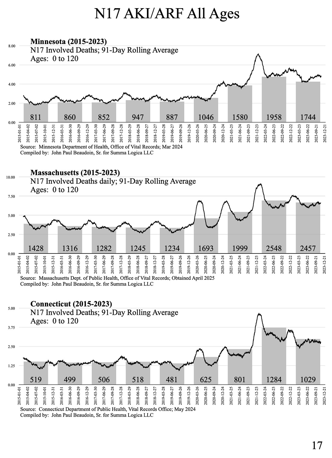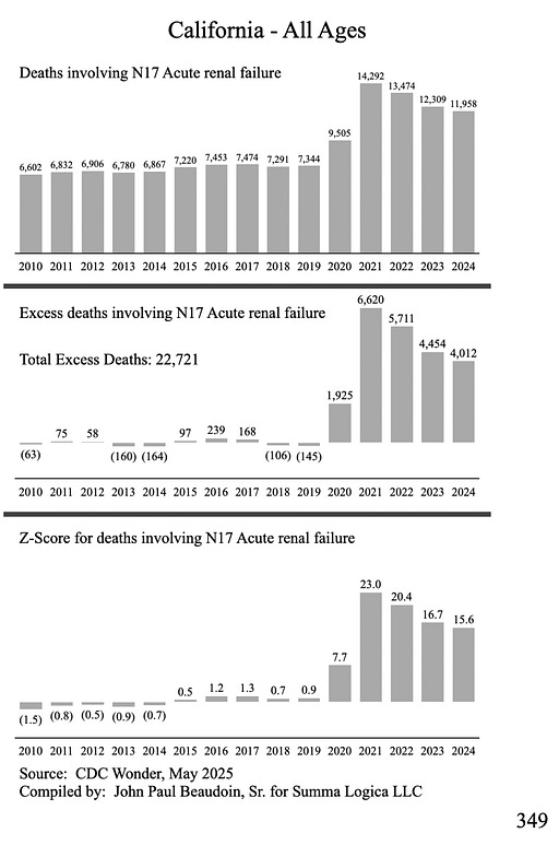 Hello Readers, Thank you for the support over the past few years. Someone sent me a message asking if I was going to post another article soon. It was an appropriate nudge. I apologize for neglecting this substack for about a month. Sometimes I get involved in a big project and drop everything else. Soon, I will announce what is already put up for sale as a book bundle on my retail web site. “Bonanza Bundle” will be the product name. The evidence therein can be used in court cases, state and federal legislative testimonies, and media blurbs and memes. The Bonanza Bundle will include ePub files of both my books, plus another 1,200 pages of graphs, documented Covid “vaccine” deaths, and the methodology of public health vigilance in pdf form. I am sending the Bonanza Bundle to various government entities. If Palantir intends to enter the market of public health, then they will struggle for a while unless they adopt what I have already created and prototyped these past three years. The intellectual property most valuable in such a deployment is not the statistical analyses, but rather the understanding of the inaccuracies of data due to behaivor at local levels. In order to decipher the data, you need to understand the customs and practices. That is why they will fail unless they use the methods in my head. In addition to the Bonanza Bundle, I am almost done with an article on censorship occurring via groupthink among the truth movement or the health movement or the purportedly enlightened good side of the scientific and philosophical community. I don’t know what to call these people and groups. All I know is that I will not self-censor any logner in the hope that they might use their power and reach to promote the findings in my books and articles. Like many, I was told to play nice and soften the message in order to be in the “popular” club. It’s like middle school really, or some smaller high schools. There’s bullying, a popular pecking order, a desire to be invited to the cool parties, and self-censorship required to “fit in.” It never worked for me before. Why would I shut up and sit in the corner now. Hero worship is a failing of our people There are no heroes. Many purported heroes are self-serving. They’re playing roles in a drama. Money is the root of all evil and power corrupts. On the lighter side, the TRUTH cannot be stopped or hidden or corrupted. The TRUTH always finds a way. Just so this isn’t a totally worthless article of my thoughts in a moment, I will post some graphs from the new work. If you were on X last night, you saw a bunch of states individually depicted in sudden kidney failure. Here is more. God Bless you all John 14:6 TRUTH22,721 excess sudden kidney fialure in California. That’s the most of any state, but not on a per capita basis. Still, that’s huge. How can any health department or CDC miss this once-in-a-century mass homicide? Now look below at Florida and notice the TWO separate signals of death. Signal 1 is hospital covid protocol homicides via drugs and ventilators. Signal 2 (in blue) is the covid vaccine uptake. Below are ages 15-44 in Minnesota, Massachusetts, and Connecticut. The excess sudden kidney failure involved deaths are 94, 134, and 77, respectively. These are very young people. This should not be happening. I include these tables so that people can see how I am calculating excess. Below you can see N17 sudden kidney failure death sover 9 years. The black line is N17 where Covid U07.1 is NOT involved. The gray dashed line depicts total N17 deaths whether covid was involved or not. In other words, the black line is N17 with covid subtracted from it. There is a 100% increase in N17 kidney failure since covid, but not with covid involved in a big way EXCEPT in the winter of 2021/2022. Lagrevio (molnupiravir) and Paxlovid (ritonavir with nirmatrelvir) were incentivized heavily in the end of 2021. Gee, I wonder if that’s why so many people were in kidney failure. Below you see a big difference in the first wave between Minnesota in the Midwest and Massachusetts and Connecticut in the Northeast. Why is that first wave missing from Minnesota? Did they not have a remdesivir trial in their hospitals? Did they not get the memo to go hard on ventilators as of March 2020? How does a virus selectively change causes of death and timing of death by location? Oh, it’s only correlated to the policies that occur exactly on those dates. It’s not causation. Just because a hospital gets $200K to run a drug through someone’s veins based on a positive PCR test doesn’t mean they’re going to do it. But they did. The idealized graphs below show you theoretical signals of what the addition of two signals would look likel. After these idealized graphs, there are posted the actual graphs from the three states. Below you will see why I say there are two signal. It’s obvious when ponted out to you. I remember someone yelling at me that they’re all remdesivir deaths. LOL. No. I’m not going to listen to someone with a bad attitude yelling at me in an X space. I will follow the TRUTH and deliver facts. Here you go. And I can separate them and say that the hospital homicides and protocol kidney kills were surpassed by the covid “vaccine” kidney kills in 2024. Sorry I’ve been lax about posting on substack. I’ll try to get this other article out soon. You're currently a free subscriber to The Real CdC’s Newsletter. For the full experience, upgrade your subscription. |