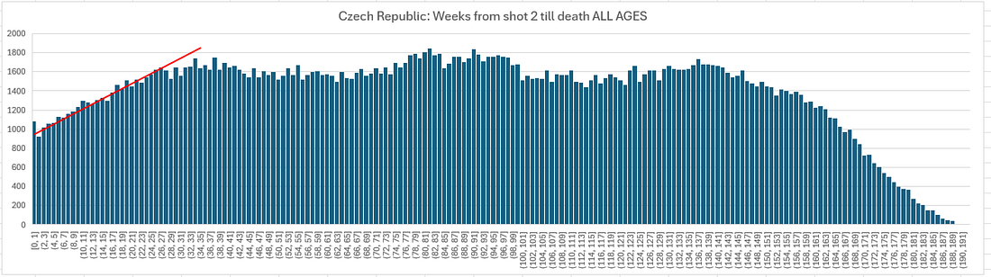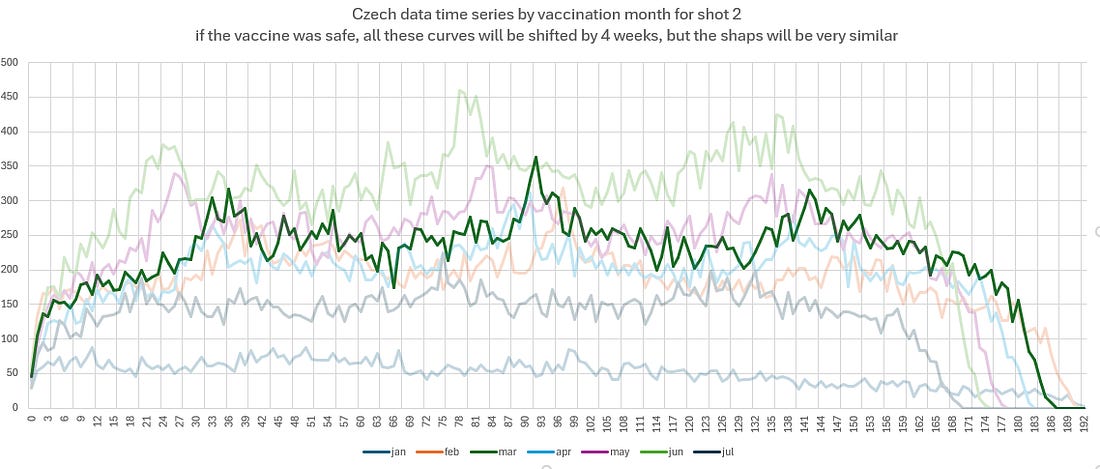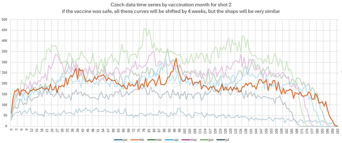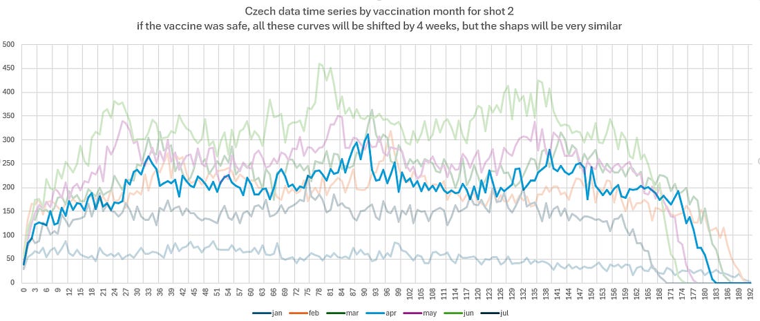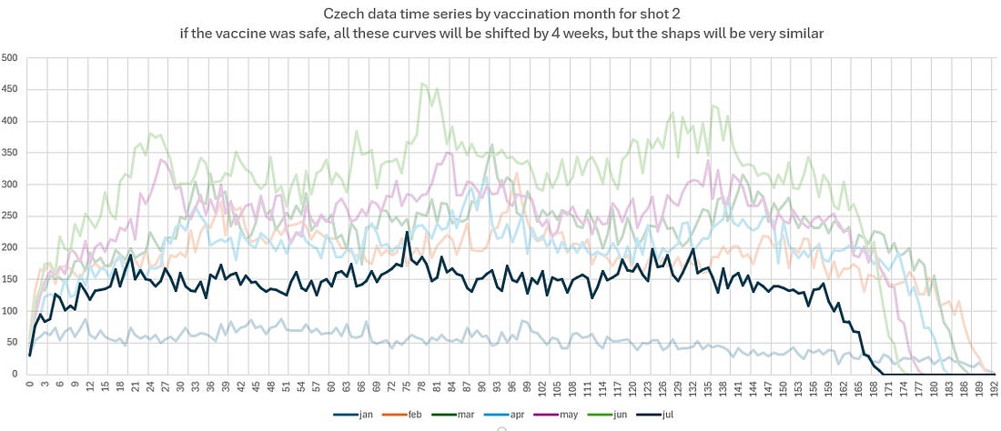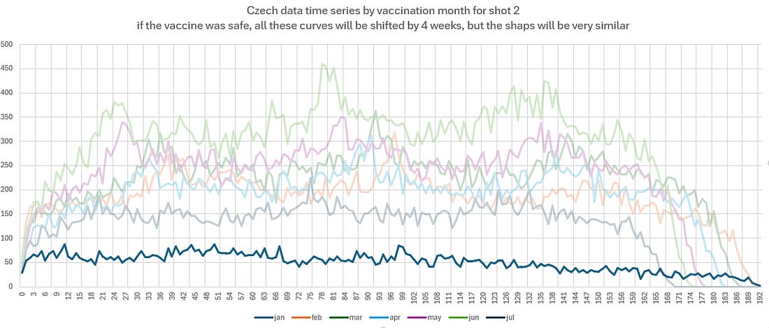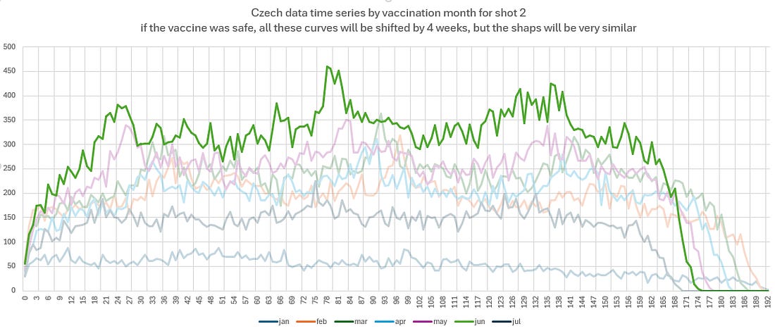 Czech time series plots by month of vaccination show a massive kill signalThere is no other way to explain this data. So everyone will ignore it because nobody likes to admit they were wrong.Executive summaryI plotted the Czech time series data by month of vaccination. If the vaccines were safe, these would all be left shifted versions of the same shape. They aren’t. There is no known explanation for that other than the vaccines weren’t safe. Here’s the confirmation. What’s a time series?It’s a plot of the deaths per week against time since the shot was given. In my case, shot #2 in the Czech Republic. For a safe vaccine, the slope is a relatively flat line, with some seasonal peaks. The slope depends on the average age of the people dying and will be negative if over 86 years old, neutral around 85, and slightly sloping up for fixed cohorts with a younger average age of death. For example, young cohorts will have a 5% increase in weekly deaths by the end of the year, so halfway through the year, the deaths will only be a little higher, nothing noticeable. What does the Czech data showIt shows all the world’s health officials were wrong. Not only that, it shows when we expose that they were wrong, they will still refuse to admit it. That is why they keep the data hidden from view. Here is the dose 2 time series for everyone in the Czech Republic.