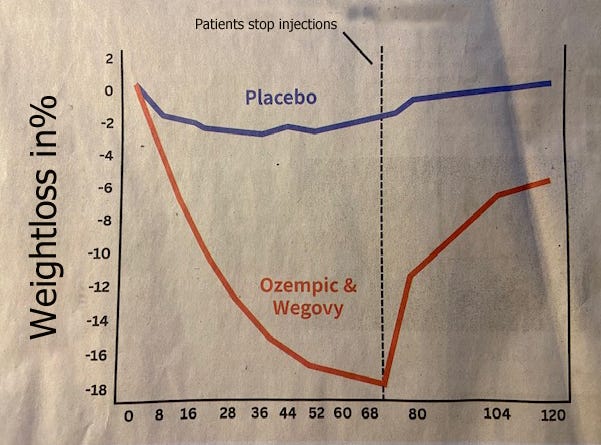 If the weight loss treatment with Semaglutide is not accompanied by a change in dietary habits and exercise, weight will bounce back to the original weight before Semaglutide was started. This creates a kind of dependency on Semaglutide to maintain one’s ideal weight. One could ask if this is not like using an addictive drug. It reminds me of an old Twilight Zone episode where a lady gets water delivered to her apartment. As soon as she drinks it, her wrinkles disappear, and she looks much younger. She remains this way until the water runs out when she turns into an ugly wrinkled old woman. Once the next water delivery comes, she drinks it, and she turns back into a beautiful young woman. Until the water runs out again. The next time the water comes, the price has doubled. She pays for it and the same thing happens, turning uglier each time. The next time the price quadruples and on and on it will go putting her in the position of paying a fortune or looking older each time the water runs out. Semaglutide, also known as the brand name Ozempic, is a GLP-1 (Glucagon- Like Peptide-1) analogue. This means it binds to the GLP-1 receptors in the brain, gut and pancreas. Natural Production of GLP-1 in the body It is naturally produced in the intestines. Its secretion can be increased by a diet rich in foods that improve gut health and by mindful eating practices. Foods that improve gut health are fiber found in fruit, vegetables, whole grains and legumes but also foods rich in Omega-3 fatty acids such as Avocado, fish and olive oil. Prebiotics such as found in bananas, asparagus, oats, garlic,onions as well as probiotics found in yogurt, kefir and other fermented foods improve gut health by feeding the microbiome. A particular strain of gut bacteria, Akkermansia muciniphila, has been shown to increase GLP-1 production. Mindful eating practices means being in the present moment when eating, chewing food thoroughly and slowing down. Exercise has a positive influence on GLP-1 secretion Effects of GLP-1 It decreases the release of the hormone Glucagon in the pancreas. Glucagon’s primary role is the increase of blood sugar when levels drop. It does that by signaling the liver to break down Glycogen (stored glucose) into glucose. It also signals the liver to make and store glucagon from non-carbohydrate sources such as protein and fat. And it tells the liver not to use glucose for energy production. It promotes the breakdown of fat cells so the liver can use it to make glycogen. GLP-1 is the antagonist of Glucagon and promotes the release of insulin from the pancreas to lower glucose levels and as an antagonist it suppresses the release of Glucagon. In the brain GLP-1 increases the feeling of satiety by increasing the sensitivity to Leptin (the “feel full hormone”) and it suppresses its antagonist Ghrelin, the “I feel hungry” hormone. GLP-1 delays emptying of the stomach contributing to feeling full faster and longer, thus reducing food intake. These combined effects lead to decreased consumption of calories and a lowering of blood sugar. Other not so nice effects of Semaglutide The most common “side effects” are nausea (between 15 -44% depending on the formulation and the dosage). Nausea will contribute to eating less as well. Diarrhea was found in 8.5 -30 %, again depending on the formulation and dosage. Diarrhea will contribute to weight loss, but not fat loss. 5-24% experience constipation depending on dosage and formulation (Wegovy is worse than Ozempic). Fatigue is often reported and can be a consequence of eating less, lower blood sugar levels and the above side effects. Some using Wegovy report hair loss. Muscle loss is always associated with weight loss unless steps are taken to prevent it such as eating enough protein and resistance training exercise. In Ozempic and Wegovy trials, other potential side effects include: - Pancreatitis (inflammation of the pancreas) - Kidney problems like acute kidney injury, especially associated with nausea and vomiting - Gallbladder problems like gallstones and gallbladder disease - Increased heart rate - Mental health issues - Diabetic retinopathy (an eye condition that can happen to people with diabetes) - Thyroid cancer or thyroid tumors (based on research in rodents) - There are reports of sudden blindness due to reduced blood flow to the optic nerve for which there is no treatment. The condition is called called non-arteritic anterior ischemic optic neuropathy (NAION). It leads to permanent blindness. Diabetics appear to have a higher risk of developing NAION. A study was done following diabetics, one group using Semaglutide and the other using non GLP-1 medication. The cumulative incidence of NAION over three years was 6.7% in the semaglutide group and 0.8% in the non-GLP-1 group, meaning they were seven times more likely to develop the condition. In conclusion causality was not proven without a doubt, but there definitely is an association between Semaglutide and NAION. Currently it is not known whether other ingredients such as lipid nano particles of Graphene oxide (GO) are contained within these shots. As GO has been found in several dental anesthetics, many vaccines, injectable HGH and Insulin we can’t rule out that it’s also contained in these products. The people following my Substack know there is a depopulation agenda happening on our planet and millions if not billions have been disabled by vaccines. I don’t have a sample of Semaglutide and I don’t have access to the microscope as it’s now at the soon to open Detox clinic a good hour away. I hope others can get their hands on a vial and have access to a good microscope, or better yet a Raman spectrograph. Long term results of Semaglutide If the weight loss treatment with Semaglutide is not accompanied by a change in dietary habits and exercise, weight will bounce back to the original weight before Semaglutide was started as shown by the below graph. Being at an idea